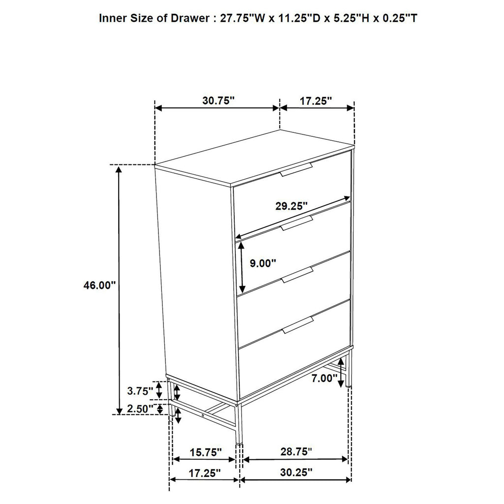 Reimagine your bedroom retreat with the crisp, clean appeal of a modern four-piece bedroom set. Its clean, precise style is emphasized with sleek silhouettes and a bright white finish. The set centers on a chic bed with a tall headboard and low footboard, offering fresh style with geometric tufting in dark gray padded upholstery. Black finish legs complete the bed and bring cohesive style to the set, matching bases and hardware on the dresser and nightstand. The dresser offers plenty of storage and includes a framed mirror on top, adding bright reflectivity to your bedroom ensemble.