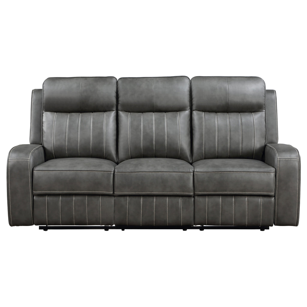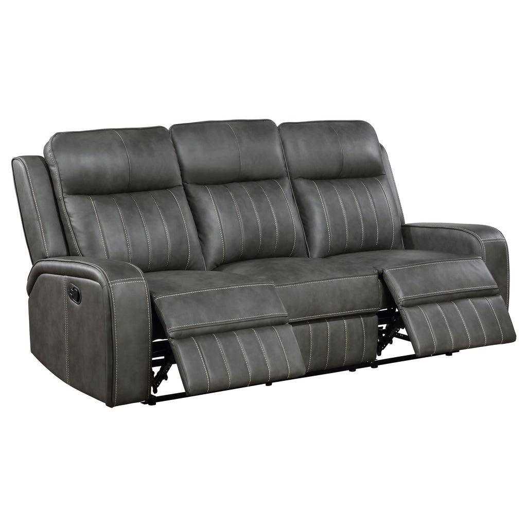 Relax in style with this transitional motion sofa set that blends modern and contemporary design. Each piece is upholstered in smooth grey leatherette with vertical topstitching for decorative detail and added dimension. Plush foam padding and pocket coil seating provide long-lasting support, while ultra-padded headrests enhance comfort. Manual reclining seats with a wall-hugger design maximize space efficiency. For added functionality, the loveseat includes a center storage console with dual cup holders._x005F_x000D_ Key Features: • Two-piece sofa set upholstered in smooth grey leatherette with vertical stitching • Manual reclining seats offer customizable comfort for daily lounging and relaxing • Wall-hugger mechanism saves floor space while allowing full recline extension • Plush foam padding with pocket coil seating ensures supportive durability • Attached cushions with ultra-padded headrests enhance everyday relaxation • Loveseat includes a flip-top storage console and two built-in metal cup holders