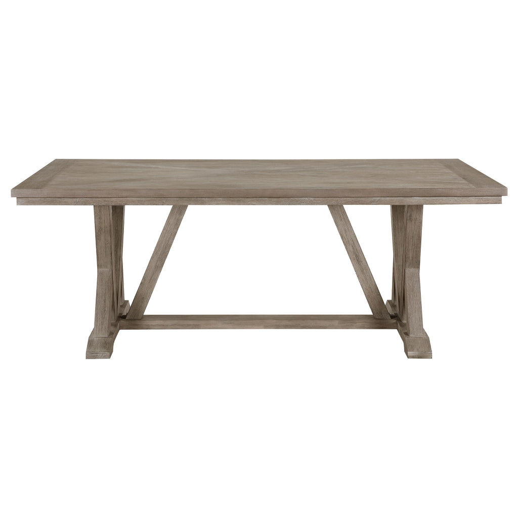 Infused with stylish character, this modern farmhouse dining table is a striking centerpiece. Perfect for the family or entertaining friends, it's a rectangular silhouette complete with a trestle base design that adds artistic flair. The table is beautifully crafted, utilizing acacia wood for excellent durability and acacia veneer for a uniform wood grain texture. A coastal grey finish is soothing and versatile, setting the tone in a relaxed kitchen or dining room. The rectangular shape of the table is optimal for seating and looks great in any casual space.