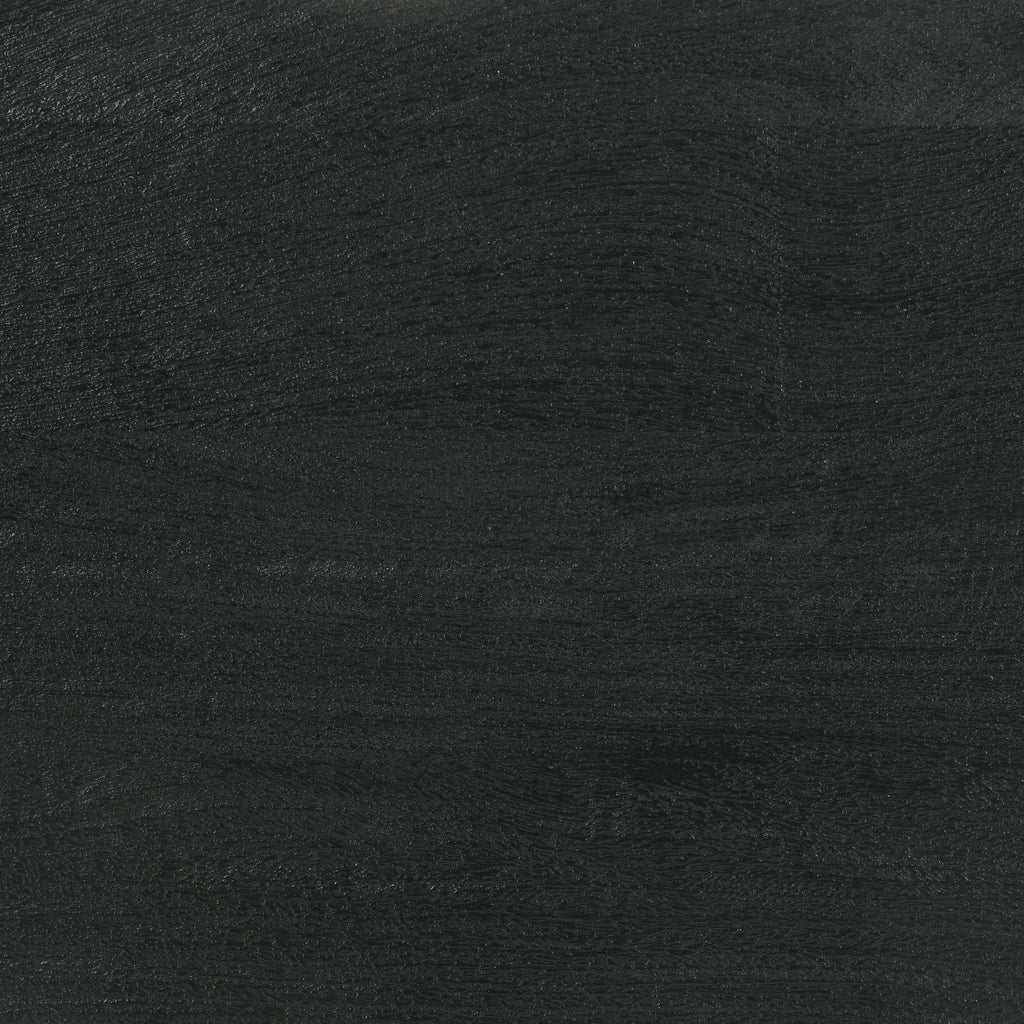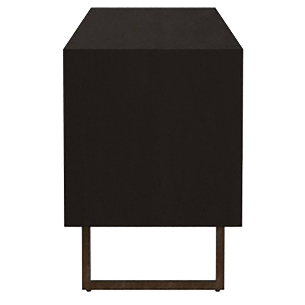A dramatic charcoal black finish coats wood products construction, adding a bold look to this casual yet elegant TV stand. Gather entertainment-related gear and organize it in this tasteful stand built of mango wood with a rustic aesthetic. Set atop black finish iron bracket legs, it creates a sturdy venue for a large flat-screen TV. Components find room in two side compartments, as incidentals and media may be stashed on a fixed shelf behind two side doors with ornate iron hardware. Avoid clutter with a pre-cut wire management hole.