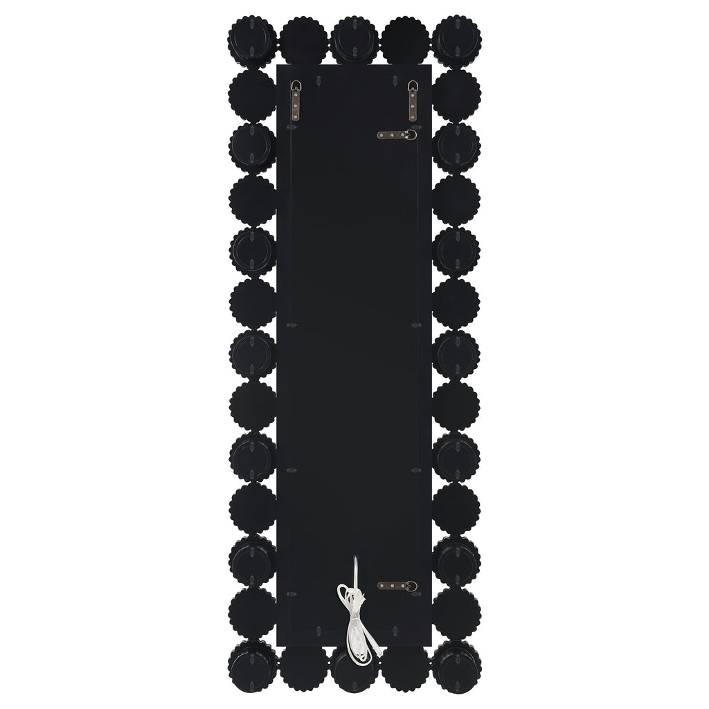The contemporary full-length mirror lends a wonderful accent piece to your rooms. Featuring 16 LED lights that offer an even glow adding a glamour style to this piece. The Hollywood inspired frame is bordered by individual round mirror tiles, each further framed in sparkling mirror trim. Bold lines and sophisticated mirror plates merge to offer a modern touch. Situate this striking accent mirror within an entryway foyer to greet family and guests, or simply find your beautiful look through this mirror. Key Features: • Full-length wall mirror with integrated LED lighting for added function and visual impact • Sixteen evenly spaced LED bulbs create balanced illumination across the mirror surface • Framed with layered circular mirror tiles bordered by reflective acrylic trim • Hollywood-style frame delivers a dramatic and modern glamour aesthetic • Tall rectangular mirror offers full-body reflection for use in bedrooms or entryways • Crafted from acrylic, engineered wood, and mirror materials for lasting quality