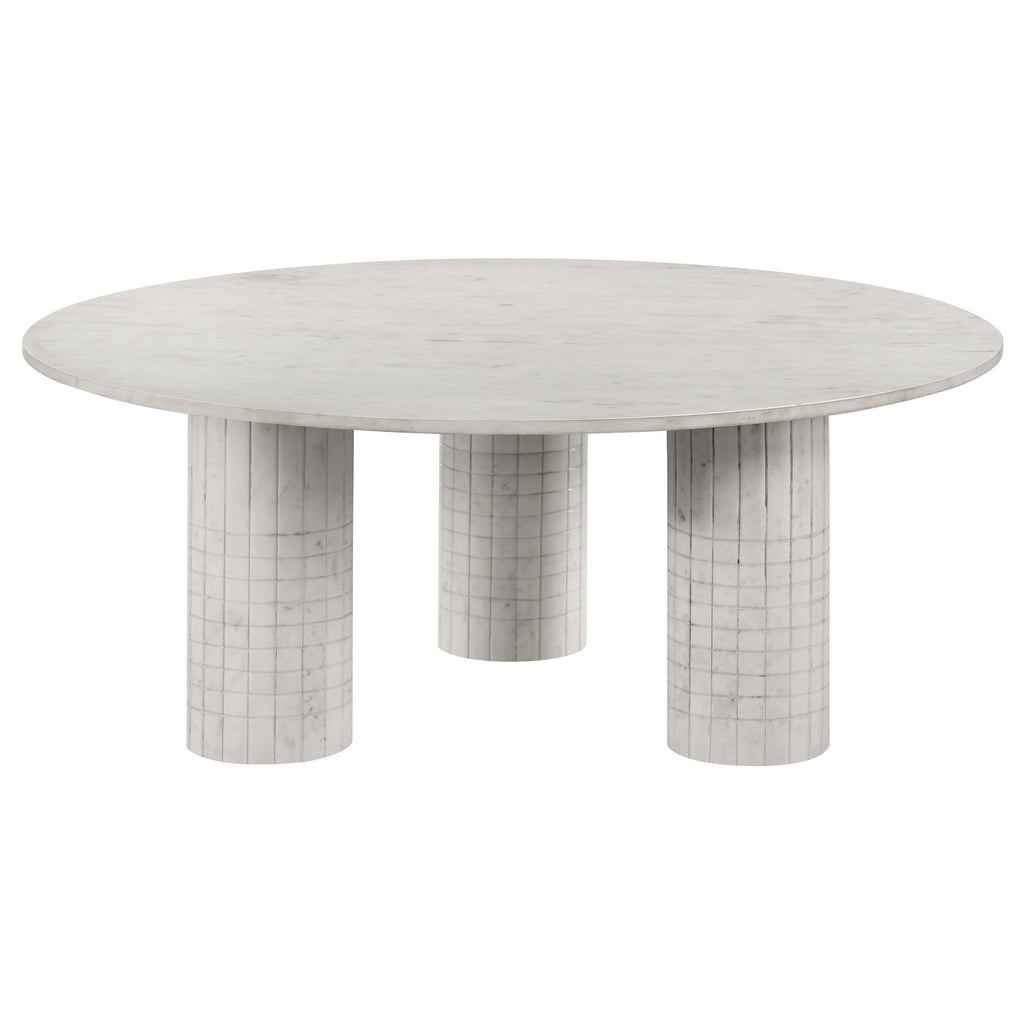 This coffee table set, featuring a coffee table and end table, showcases genuine white marble surfaces and cylindrical pedestal bases. The fluted and grid-textured design adds a refined architectural touch, blending classic elegance with modern minimalism. Perfect for creating a cohesive look in your living space, these tables are crafted for durability and timeless appeal. Ideal as functional and decorative pieces, this occasional table set brings sophistication to any contemporary or upscale interior.