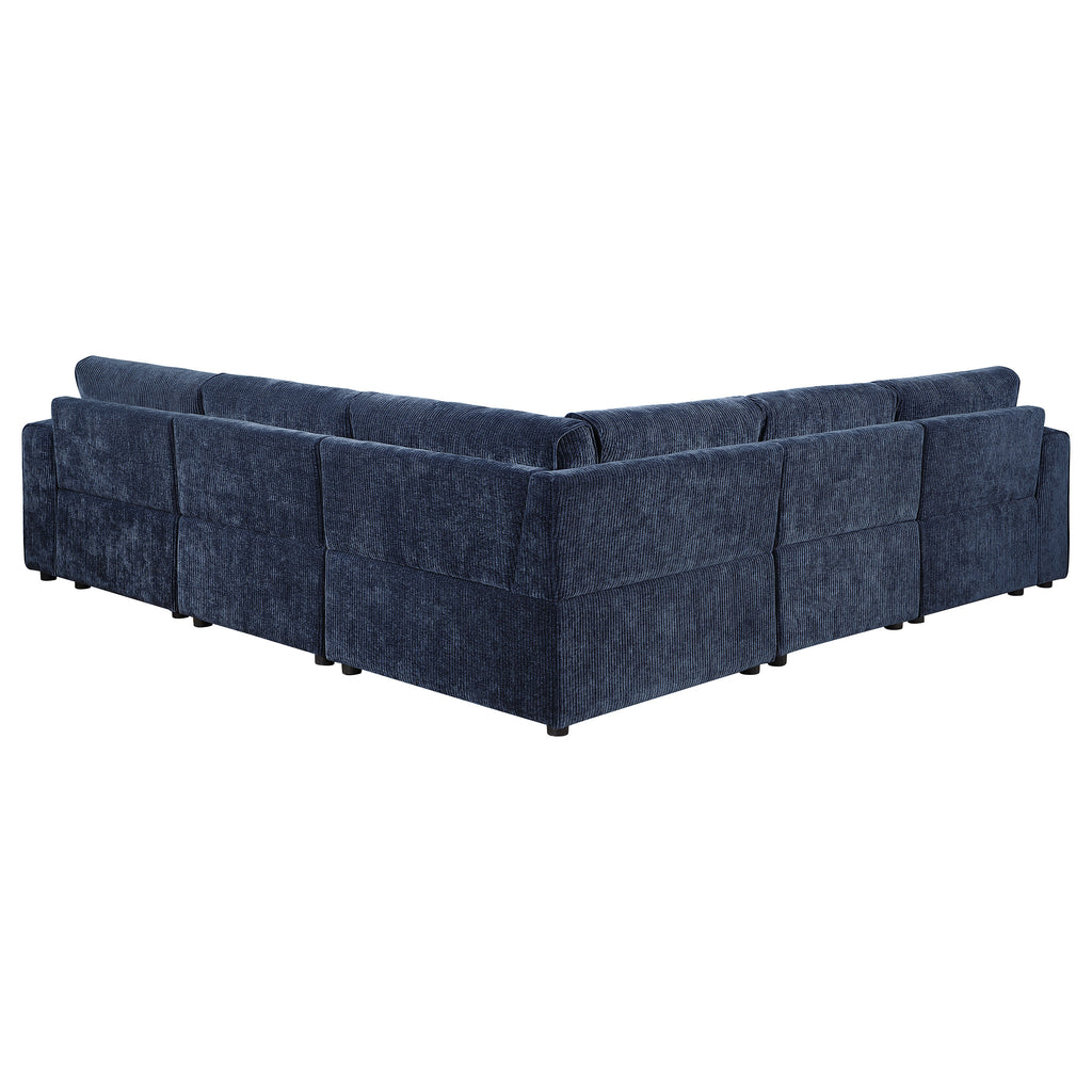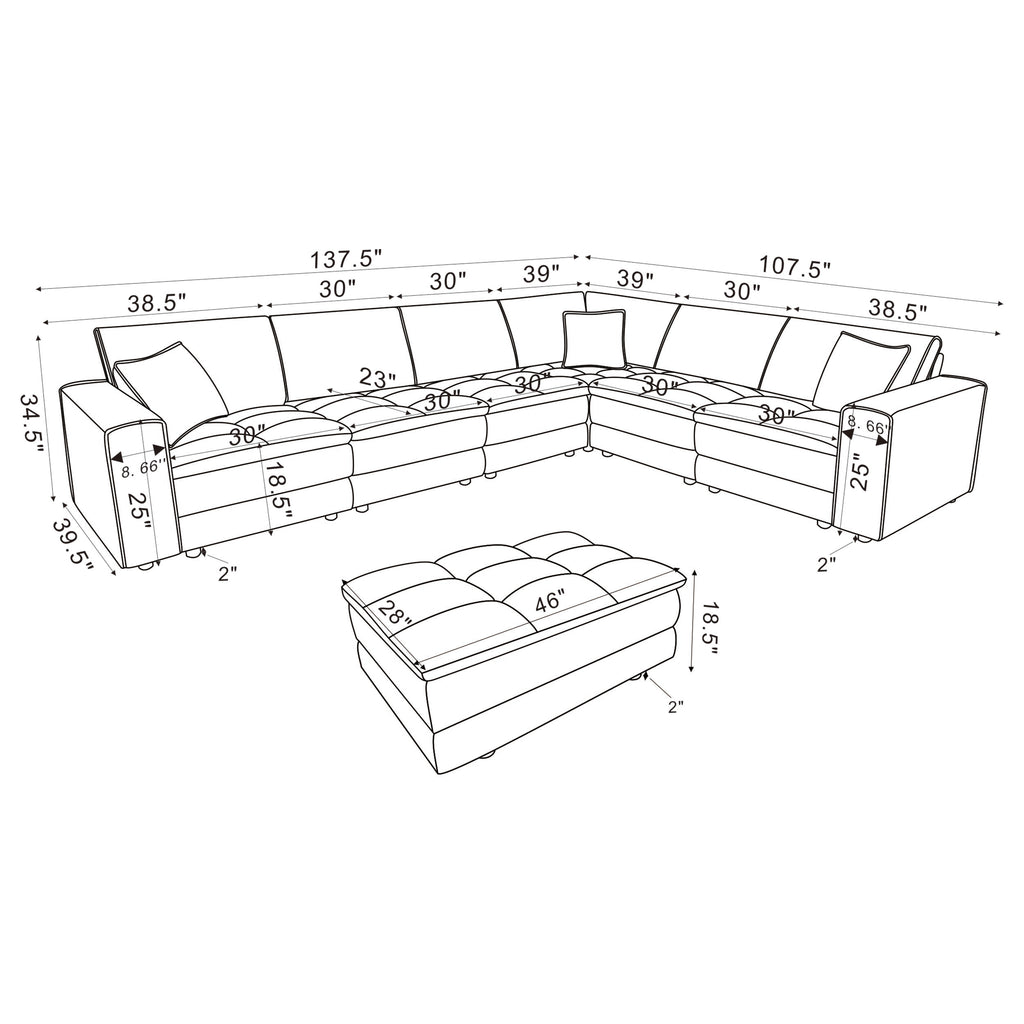 This retro-inspired modular sectional brings a blend of comfort and contemporary style to your living space. Featuring soft blue corduroy upholstery and a sophisticated grid-tufted design, it delivers both elegance and coziness. The fully encased solid and engineered wood frame ensures stability for heavy use, while sinuous spring seating and pocket coil springs provide exceptional support and durability. A matching tufted ottoman adds versatility, offering extra seating or leg support for a complete lounging experience.