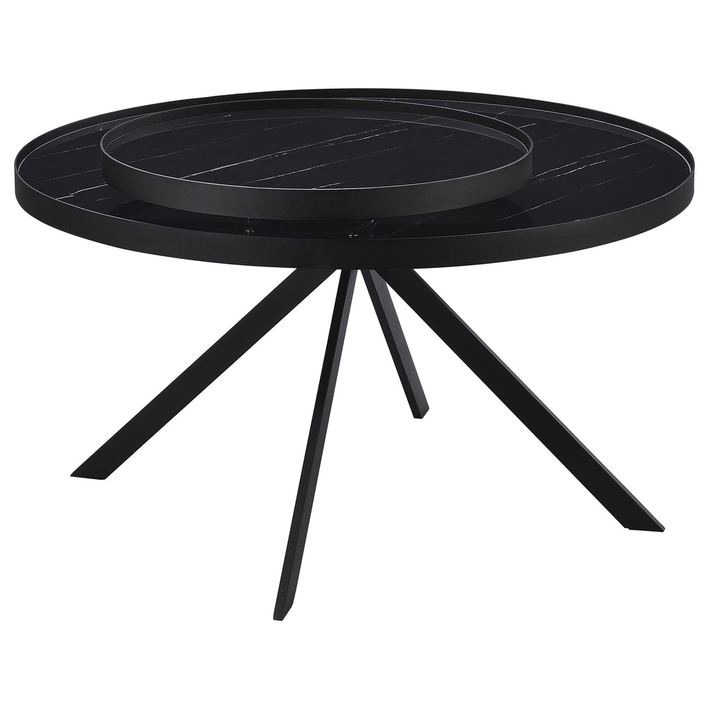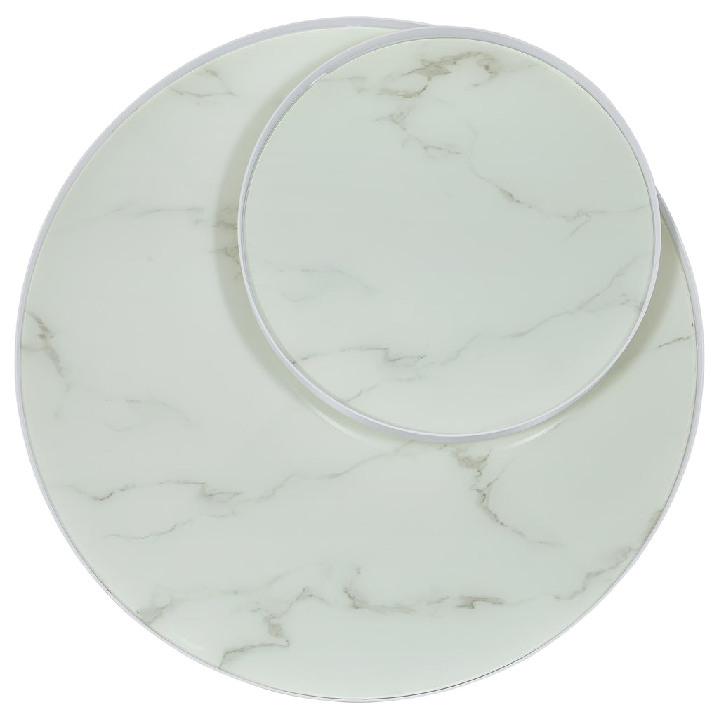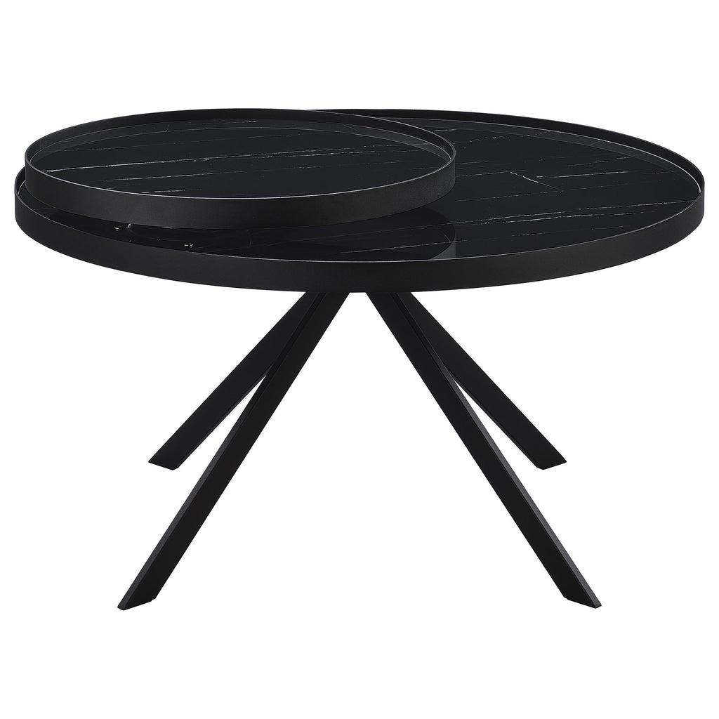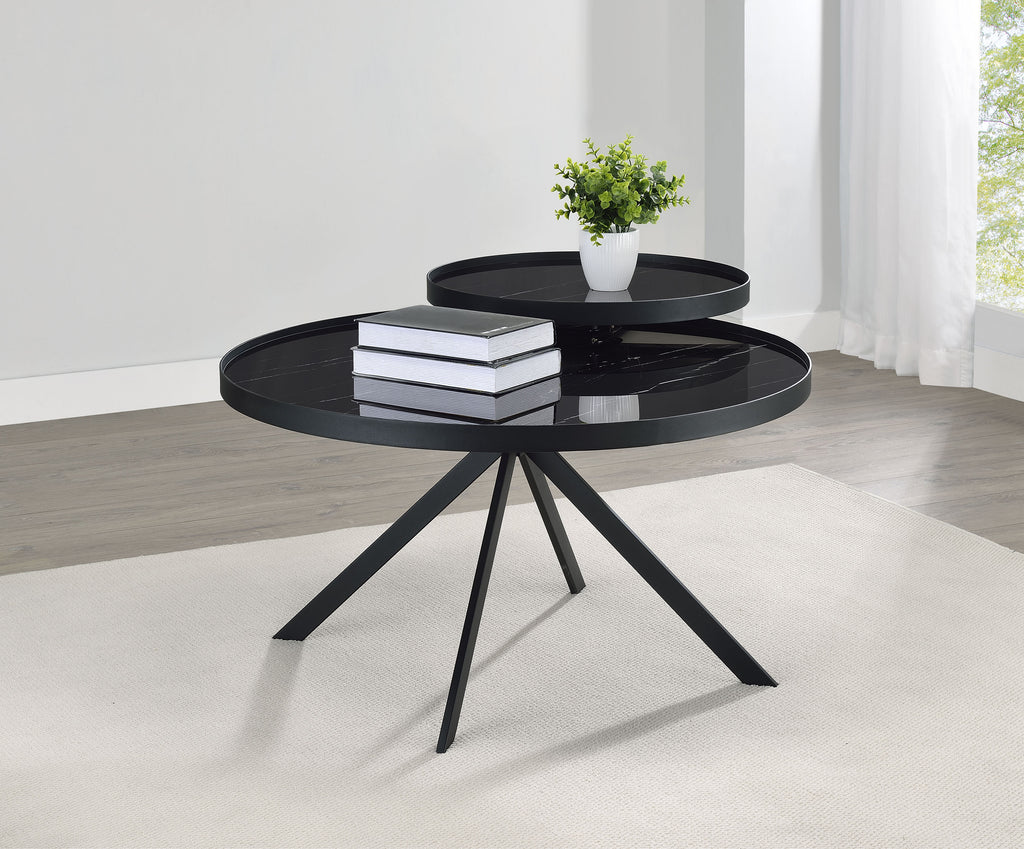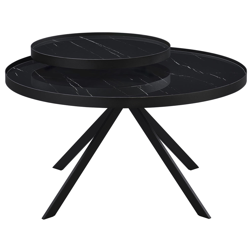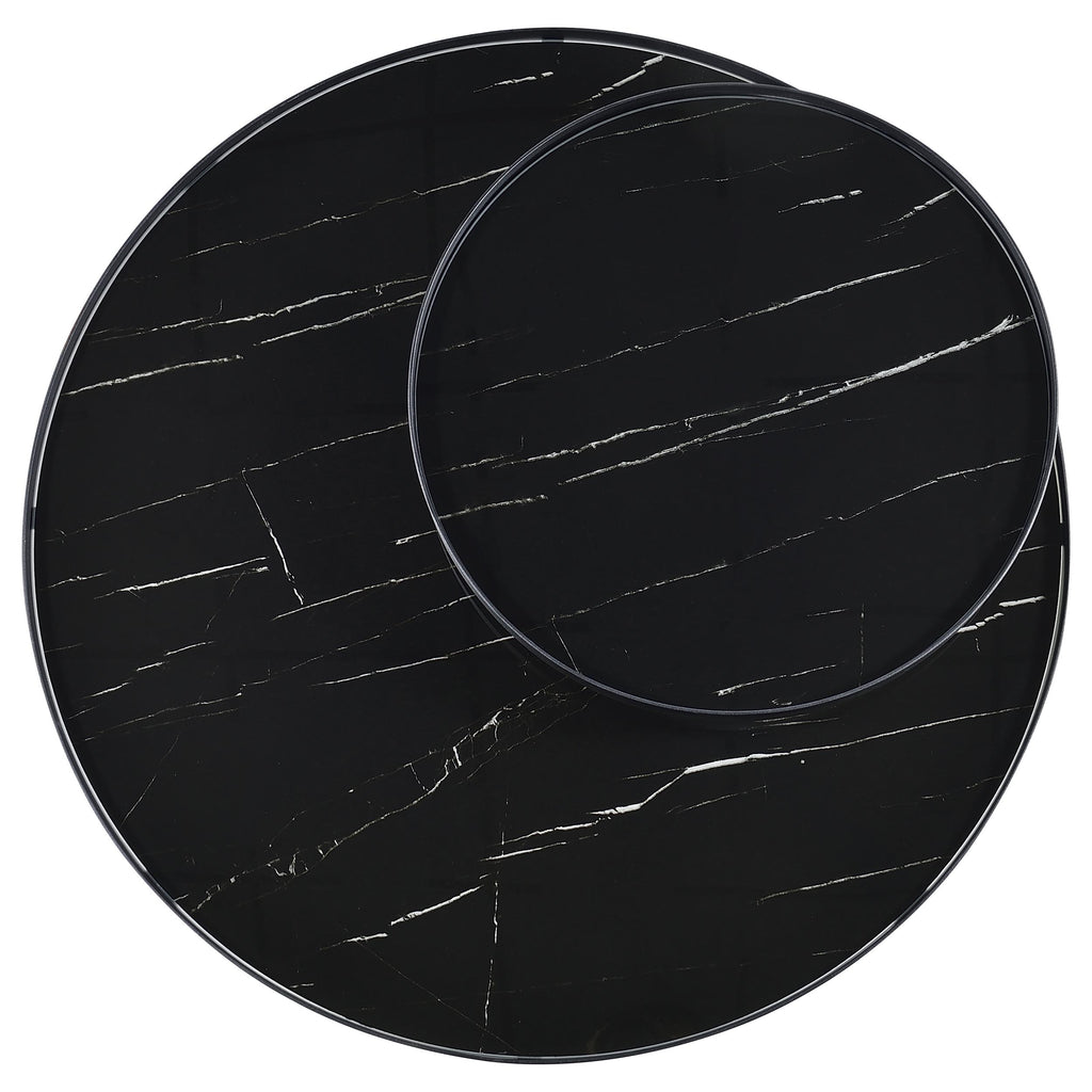 This modern two-tier coffee table features a sleek metal frame and tempered glass tops with marble-pattern printing for a refined aesthetic. Its multi-level design offers added functionality, perfect for displaying decor or organizing essentials. The sturdy metal construction ensures durability, while the smooth surfaces create a clean, contemporary look that enhances any living space with style and practicality.