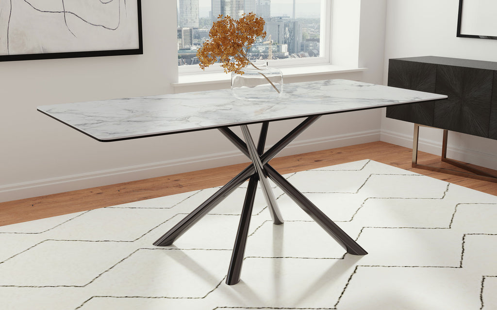 Gorgeous sintered stone brings depth and dimensionality to a modern rectangular dining table. A true centerpiece in your kitchen or dining room, it boasts an enchanting white mirage finish on its table top, offering multi-tonal allure with a hint of glam. The modern design includes a bold sculptural base that provides support with its starburst motif. The base receives a glossy black finish, offering a slick, sophisticated touch of sculpted elegance. Choose seasonal or timeless table linens and enjoy delicious meals with family and friends.