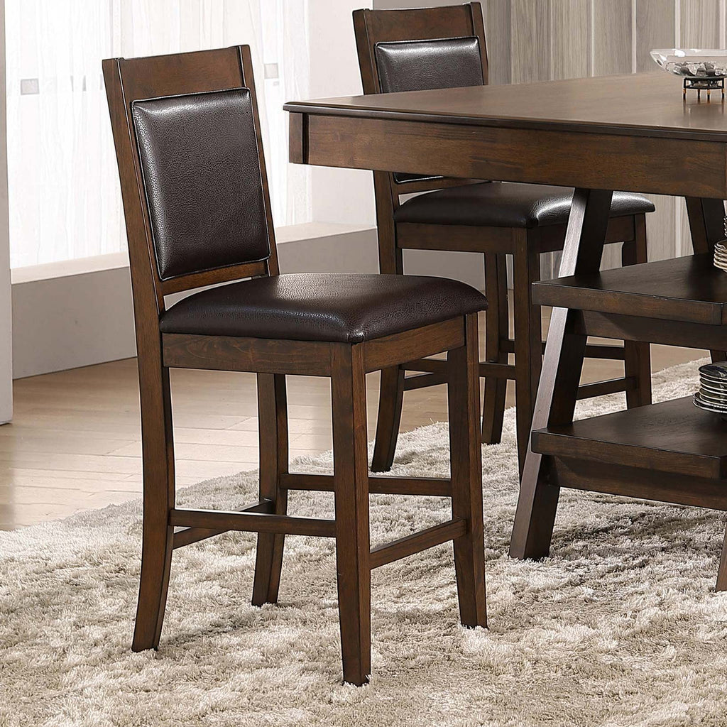 Blending timeless craftsmanship with modern comfort, this counter-height chair offers a sophisticated seating solution. Its rich walnut wood finish highlights the natural beauty of the rubberwood frame, while the padded seat and backrest provide luxurious support. Upholstered in smooth brown faux leather, it ensures durability and easy maintenance. A woven panel back detail adds texture and dimension, making this chair a standout piece for any counter or bar-height dining space.