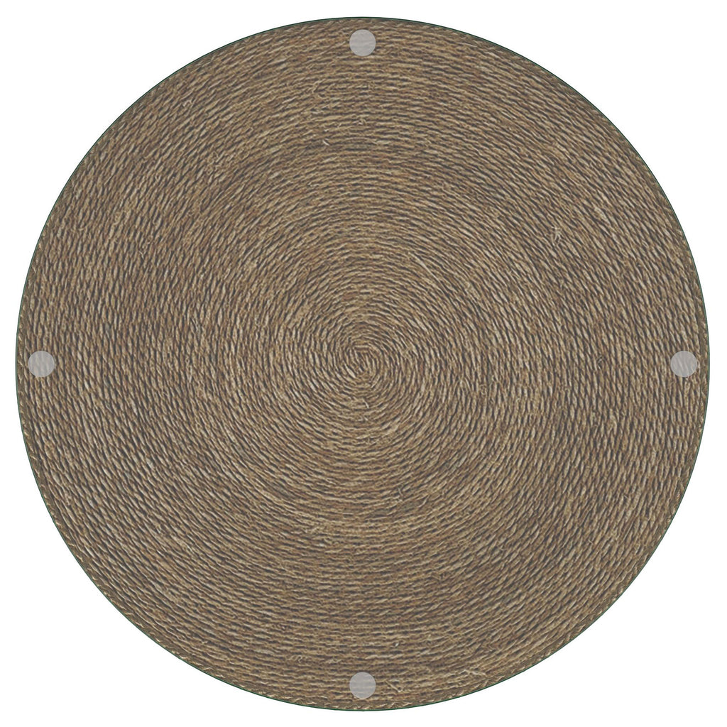 Wrapped in handwoven seagrass, this round accent table adds organic warmth to any living room. A clear tempered glass top offers a smooth, functional surface while revealing the textured beauty beneath. Its cylindrical form is supported by a durable plywood frame and finished in a light natural tone. This occasional table blends rustic charm with modern simplicity, making it ideal as a side table, end table, or compact cocktail table.