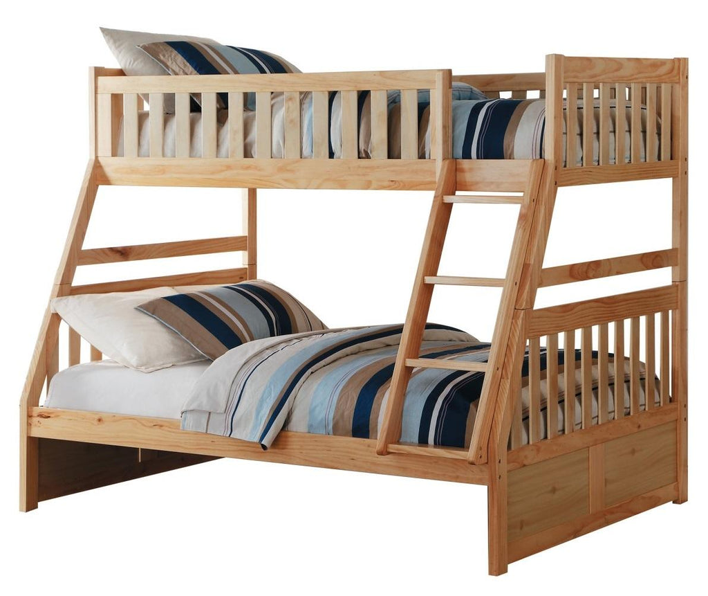 Maximizing sleep space is achieved with the stylish Bartly Collection. This transitional twin over full bunkbed is featured in a natural pine finish making it an appropriate choice for a number of youth bedroom settings. Also available: twin over twin bunkbed, full over full bunkbed, twin over twin trundle bed with two built-in drawers, twin/twin bunk with reversible storage stair steps, underbed dual toy boxes, twin trundle, nightstand, dresser, mirror and chest.