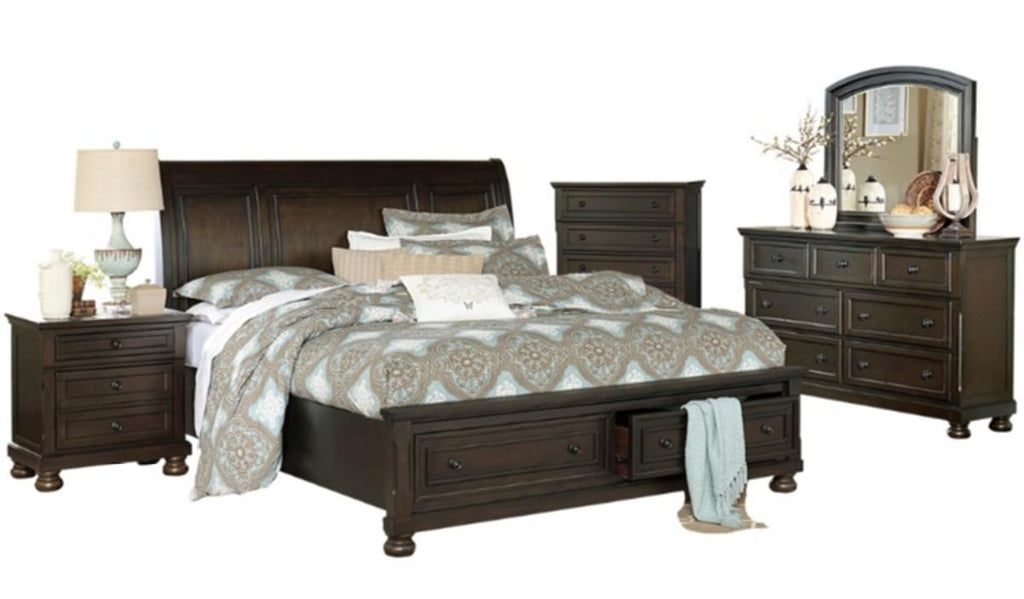 Casual transitional styling lends versatility to the placement of the Begonia Collection in a number of bedroom settings. The grayish brown finish lends distinctly to the execution of different looks from traditional to country casual, with knob hardware punctuating the framed drawer front of the Eastern King bed’s footboard. The storage drawers of the footboard provide a means of additional storage capability. Bun feet support the sleigh bed lending additional decorative touch to the transitional design of the collection.