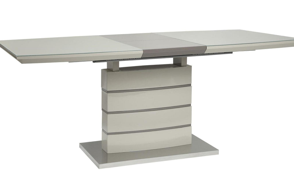 Sleek contemporary styling provides the platform which you will create your casual dining space in the Glissand Collection. Ultra-bright high gloss white and gray-taupe finish is paired on the tabletop and pedestal base, creating distinct contrast to the high polish chrome base plate. A smooth glide system opens with ease to reveal the self-storing butterfly leaf.