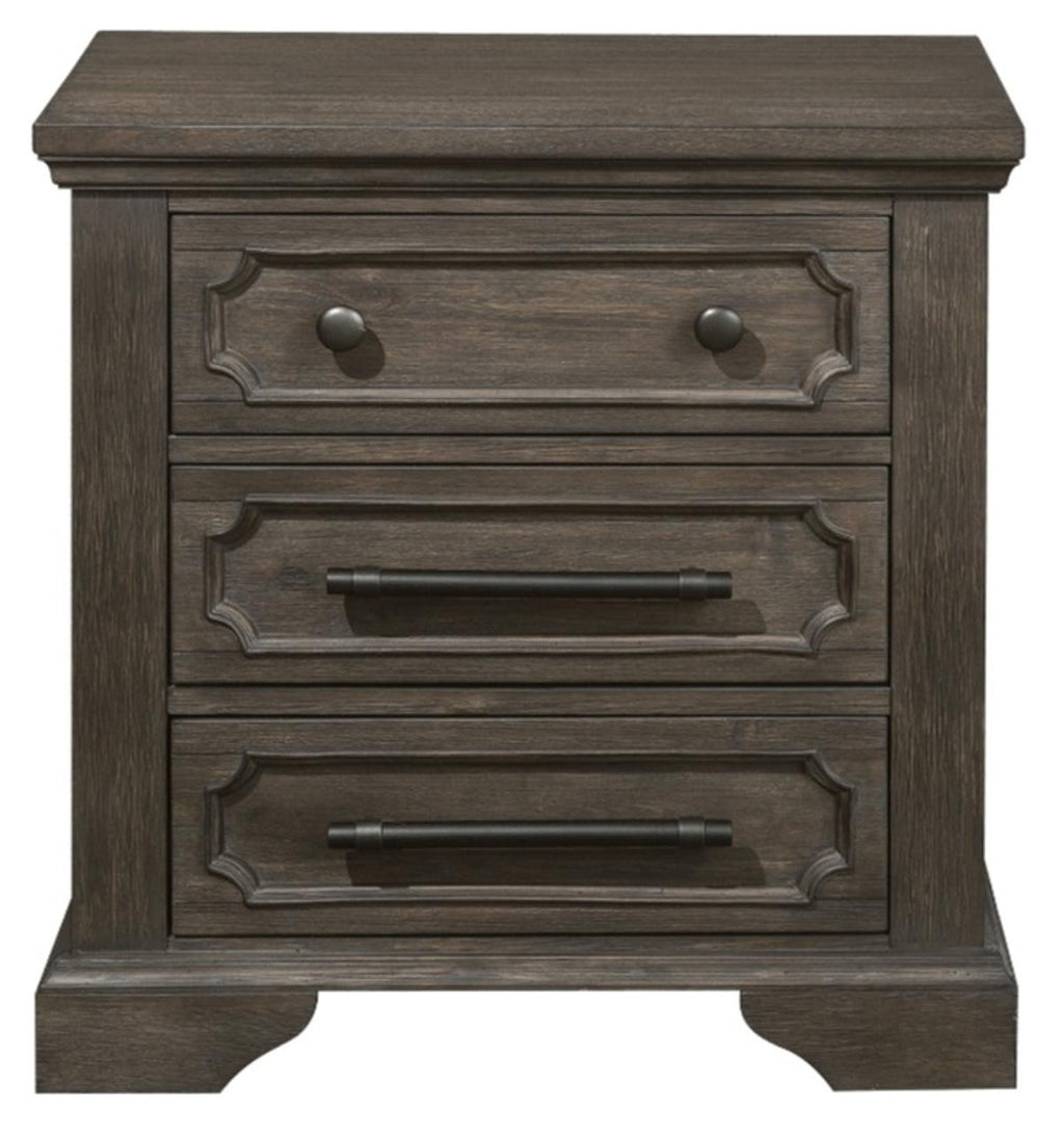 Classic framing provides elegant contrast to the unique rustic look of the Toulon Collection. Distressed dark oak finish provides texture to the acacia veneer of this lovely nightstand. The French provincial inspired routing lends decorative touch while drawer and door fronts are accented with wide set horizontal metal and wood hardware, and distinct framing.
