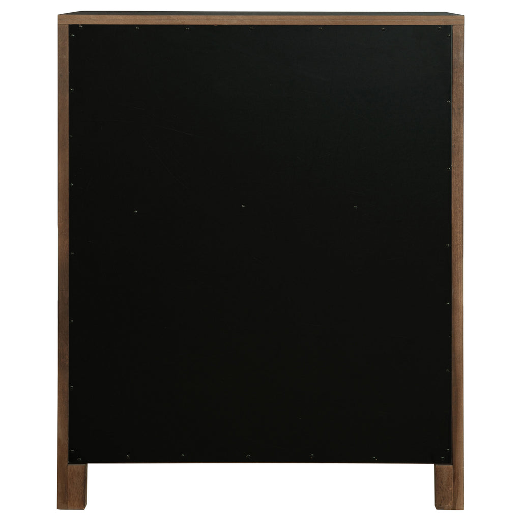 Add stylish storage in a compact footprint with this transitional five-drawer chest. Perfect for the bedroom, it boasts a rich walnut wood veneer that adds warmth to the elegance of natural grain patterns. Fingertip pulls are gently curved, creating texture and dimension for the front of the case. The chest includes rounded corners and decorative feet, adding fresh style to your bedroom or walk-in closet. Add a jewelry box or framed photo to the top to bring personality and stylish flair.