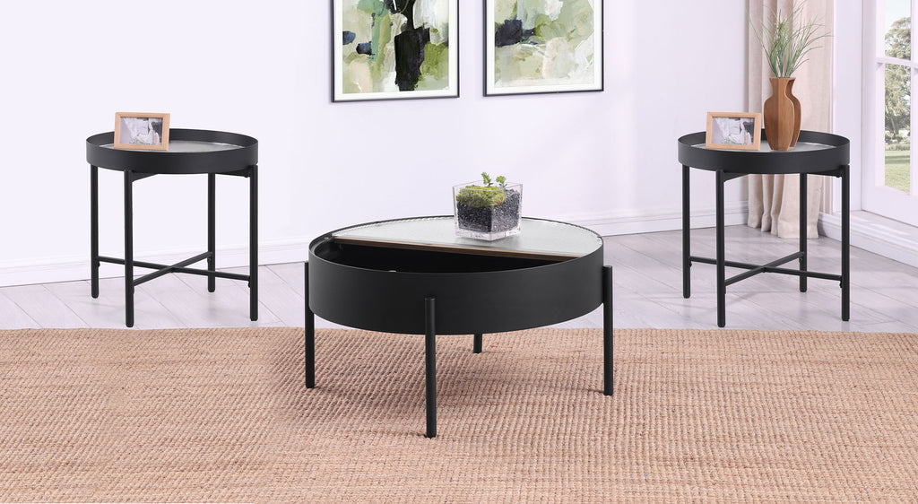 This sophisticated coffee table set seamlessly blends modern design with functional versatility. The coffee table features a dynamic two-tone top with tempered reeded glass and a sliding wood surface that reveals hidden storage. Its sturdy black metal frame ensures durability, while the end table’s sleek construction and reeded glass top add a refined touch. Finished in a sandy black powder coat, this occasional table set enhances any living room with contemporary style and practical elegance.