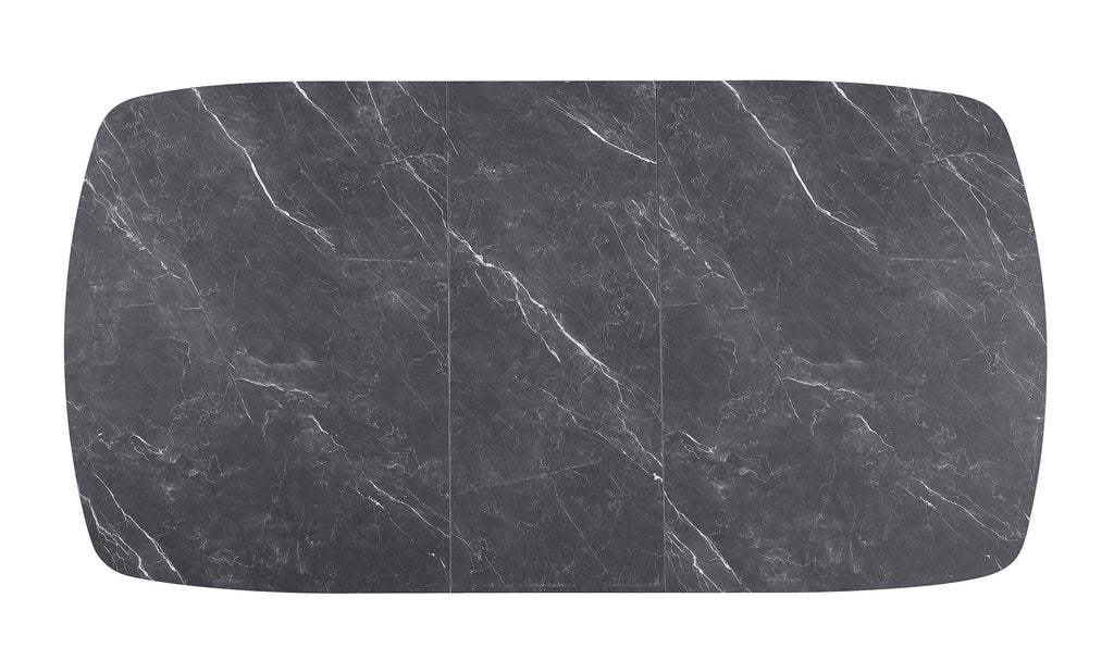 This modern dining table blends sleek aesthetics with functional versatility. The black marble-printed melamine tabletop offers a luxurious look while being scratch- and water-resistant for everyday durability. Its expandable design includes a 15. 75-inch self-storing leaf, allowing the table to extend from 57 inches to 72. 75 inches to accommodate additional guests. A bold, trapezoid-shaped base with a black hammer-tone powder-coated finish provides sturdy support, making this table a stylish centerpiece for contemporary dining spaces.