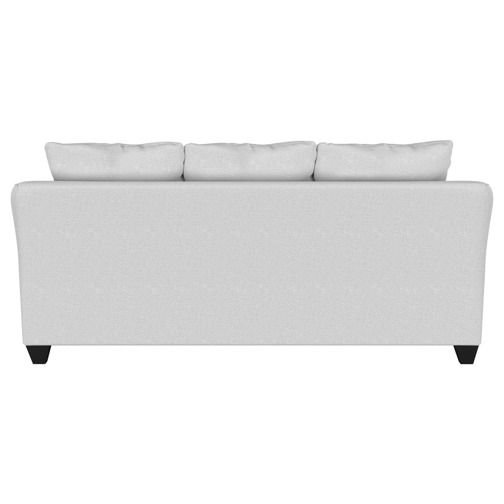 Inviting gray mist upholstery creates a rich, refined look and feel for a modern sofa. Plush cushions are filled with foam for excellent comfort. Accent pillows add both pattern and custom support when lounging and relaxing. The sofa boasts rounded arms that create a flared look, perfect for a refined but inviting family room. Attached cushions maintain a clean look and feel, with sinuous spring decking under seats for added support that lasts.