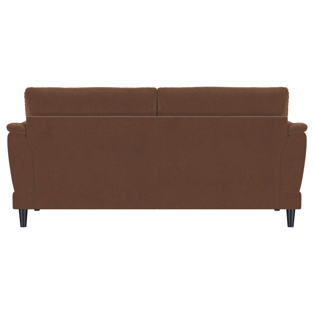 Unwind in style with this chic retro-inspired sofa, designed to deliver both comfort and timeless elegance. Upholstered in a rust woven fabric, it features plush foam seat cushions and curved tufted arms for ultimate support. The fully encased engineered wood frame ensures lasting stability, while sinuous spring seating offers durable comfort. Solid wood legs in an espresso finish complete the sturdy construction, adding a sleek modern touch to this versatile seating option.