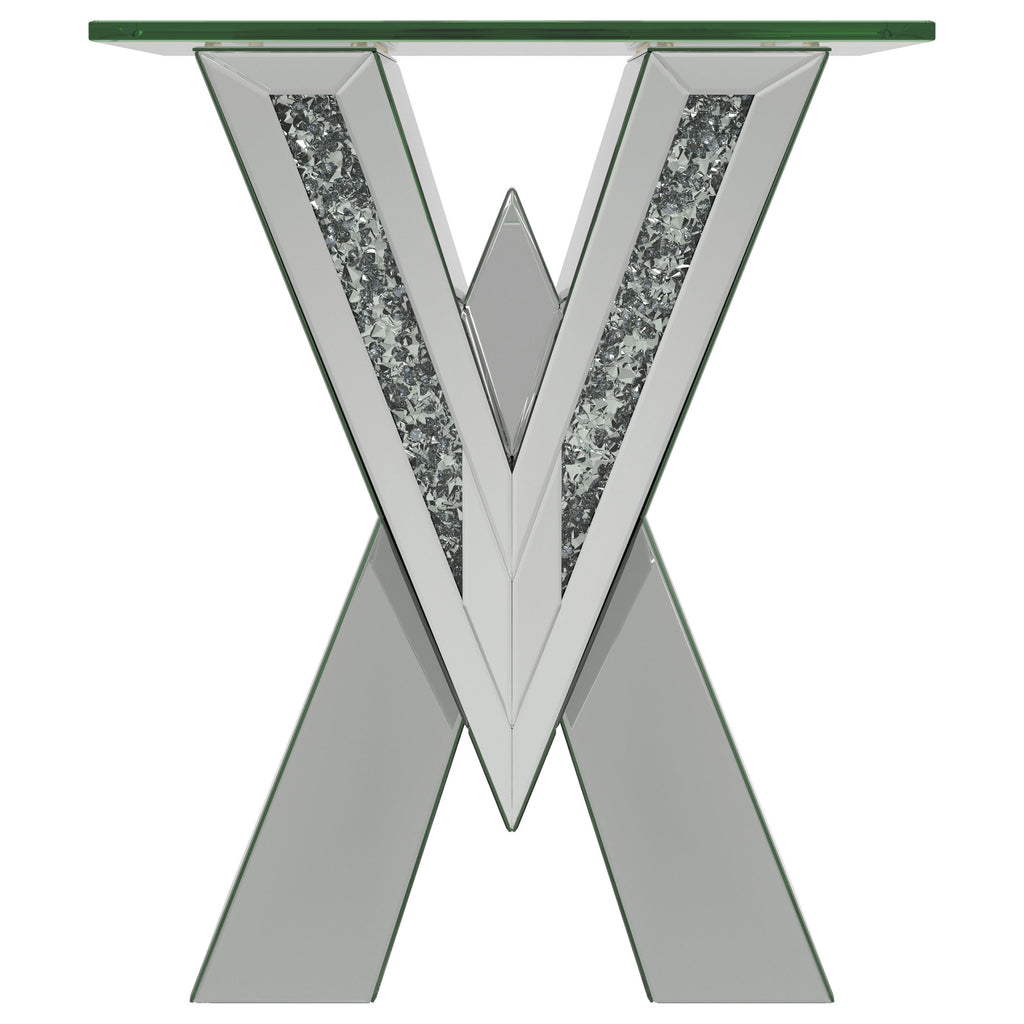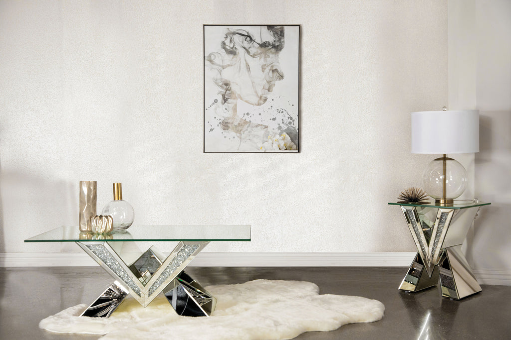 This mirrored coffee table set brings modern luxury to any living space. Featuring a coffee table and matching end table, both pieces boast bold V-shaped bases adorned with mirrored panels and glittering crystal accents. The coffee table’s rectangular glass top and the end table’s square top provide sleek, beveled tempered glass surfaces for added elegance. A perfect combination of glamour and functionality for contemporary interiors.
