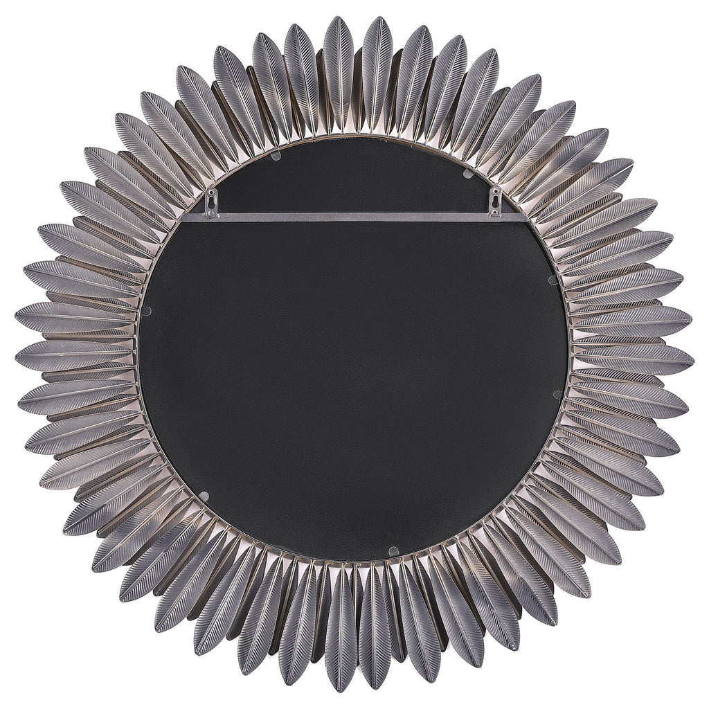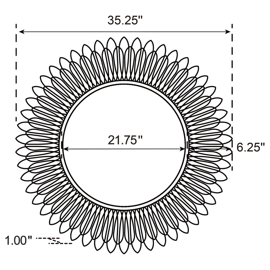 Instill the freshness of springtime in your living area or bedroom decor with a modern wall mirror. Offering sculptural presence, it boasts a center of round mirror glass. The frame is a double layer of delicate petals, introducing a floral element that creates cheerful energy in any setting. The mirror boasts a gold finish, evoking yellow daisies or bright sunflowers. Metal construction graces the frame, while MDF backing adds strength to 4mm thick mirror glass.