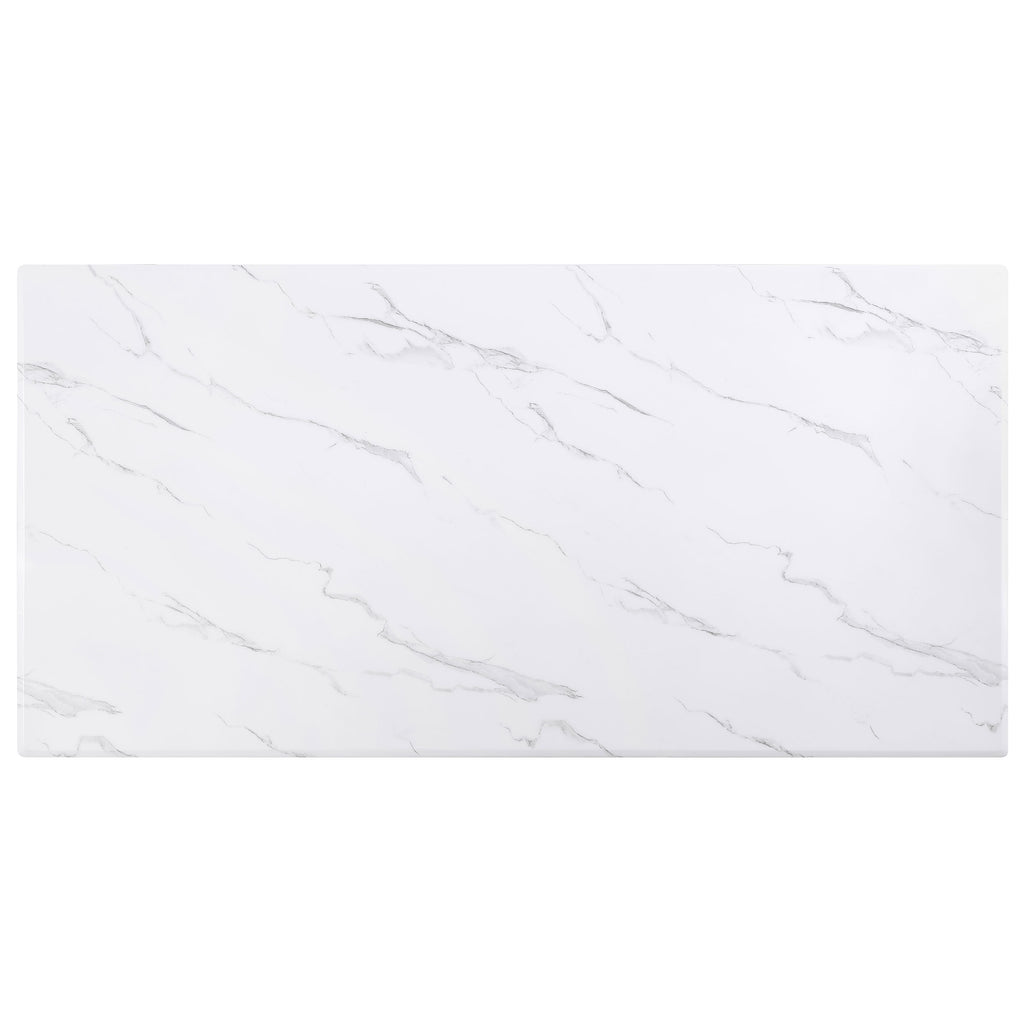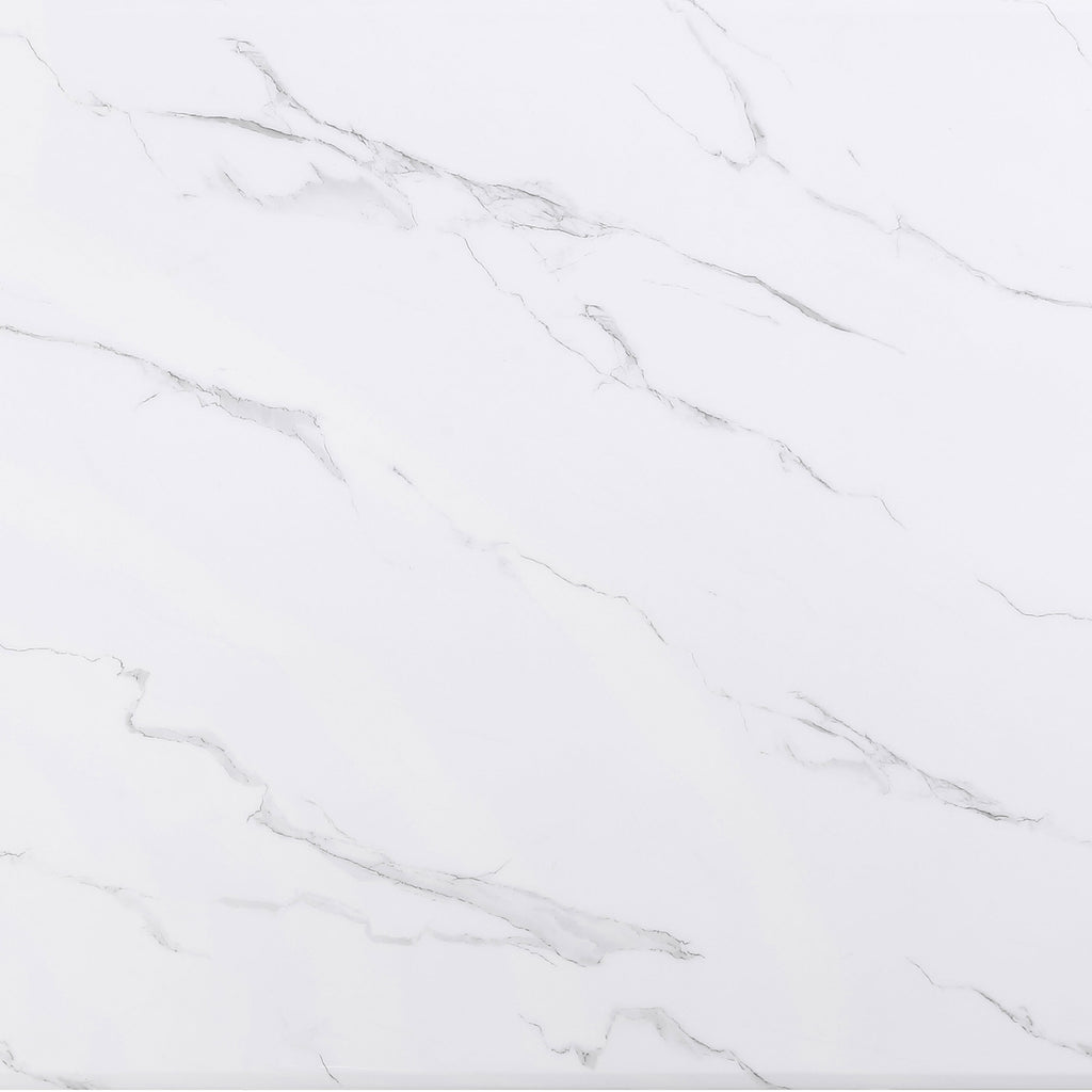 Elevate your dining room with the essence of modern luxury embodied in this white and grey marble veneer dining table. The table, constructed with engineered marble veneer, china white marble, and MDF, features a gleaming white marble table top adorned with intricate patterns and veining, adding a sense of dimension and texture. The gold finished crisscross stainless steel legs not only provide sturdy support, but also offer a touch of luxury and contemporary style.