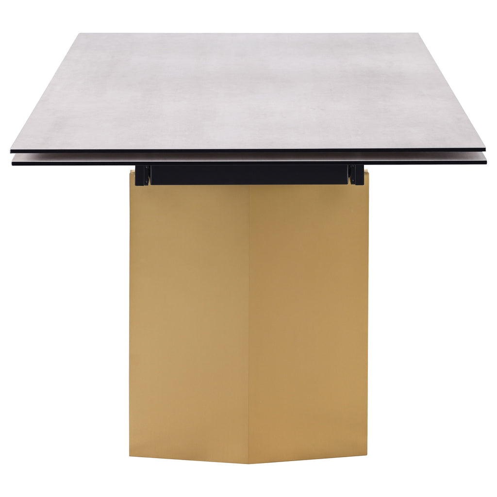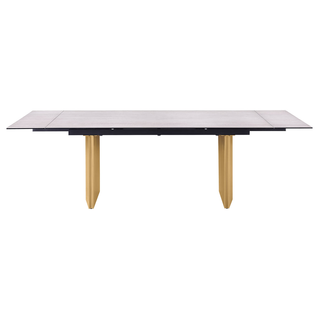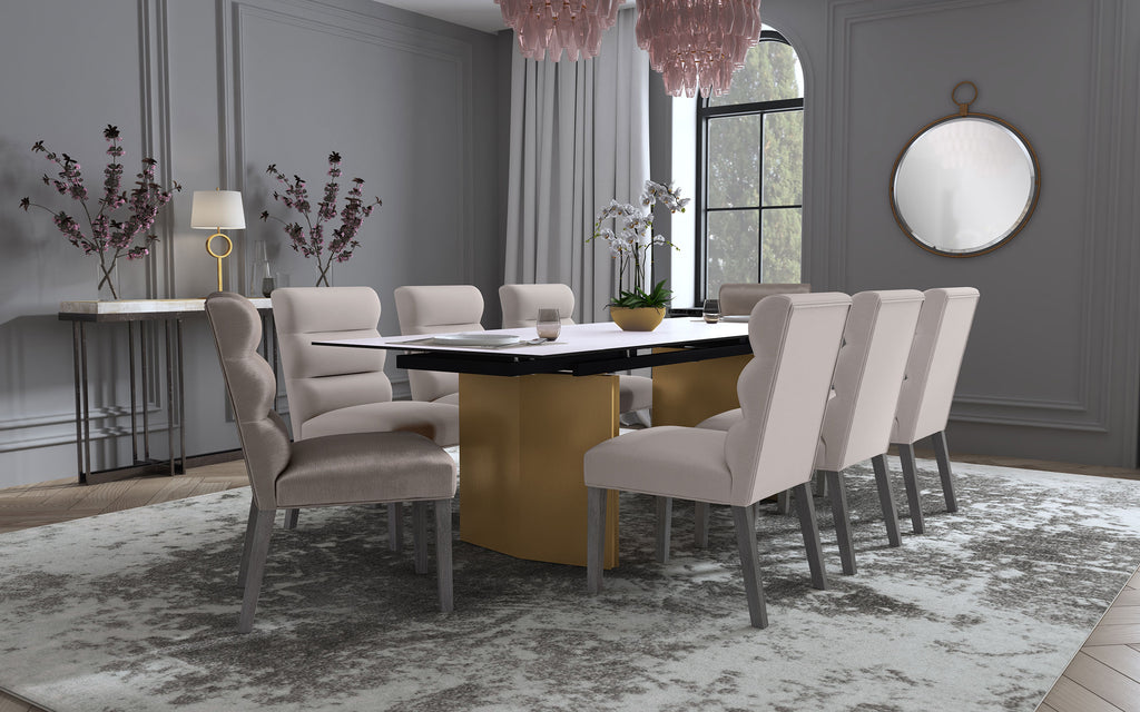This modern dining table showcases a stunning beige glass top with a 3D-printed design, supported by a brushed gold stainless steel base for a sophisticated and luxurious look. Perfect for hosting, the table features two 12-inch refractory extension leaves on each end, seamlessly expanding the seating capacity for larger gatherings. The combination of sleek materials, elegant finishes, and clean lines makes this table a statement piece for contemporary dining spaces, blending beauty and functionality.
