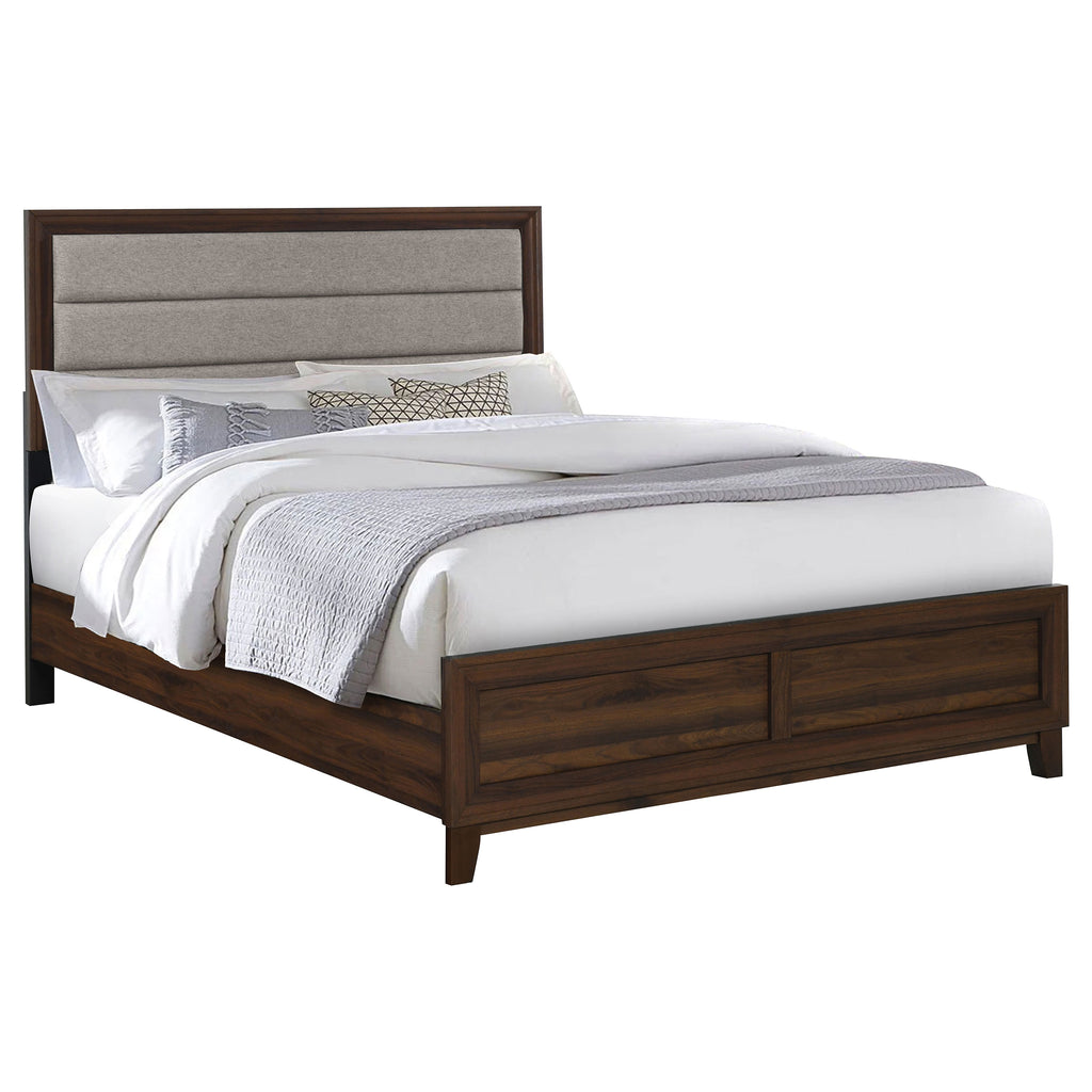 Enjoy the warmth and depth of a rich walnut wood grain finish with this modern wooden bed. Perfect for a welcoming bedroom retreat, it boasts a clean-lined silhouette with square corners. The headboard features plush foam padding with taupe fabric, offering soft, neutral contrast. The padded offers abundant comfort for reclining with a book or movie. The bed is complete with a modern silhouette that pairs its tall headboard with a low footboard, creating an open, airy ambiance.