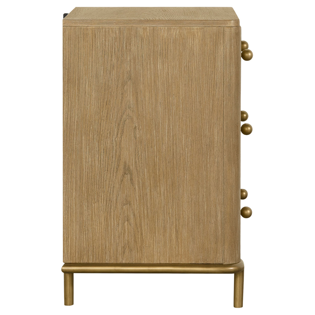 Retro charm meets modern function in this three-drawer nightstand, featuring a warm sand wash finish with subtle wire-brushed texture. Round aged brass knobs and matching tubular metal legs add a hint of glamour, while a built-in dual USB port offers convenient bedside charging. The top felt-lined drawer keeps delicate items safe, blending timeless mid-century aesthetics with everyday practicality for a refined and functional bedroom accent._x005F_x000D_ Key Features: • Three-drawer nightstand with soft sand wash wire-brushed finish • Aged brass knobs and metal legs enhance its mid-century appeal • Top drawer lined with felt to protect delicate items • Built-in dual USB ports for convenient bedside charging • Crafted from rubberwood, engineered wood, and ash veneer • Elegant rounded corners and tubular legs add modern balance
