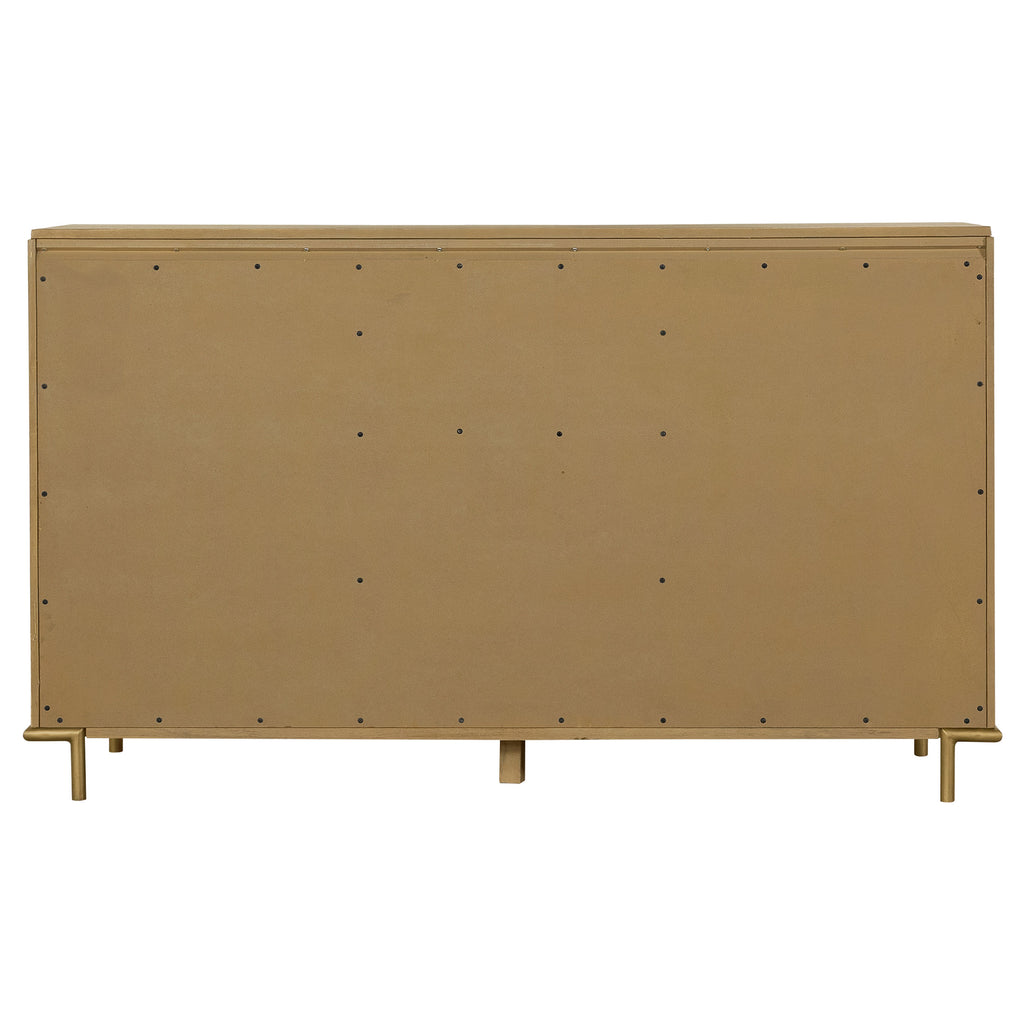 Sophisticated and timeless, this eight-drawer dresser blends mid-century modern design with subtle coastal charm. Its sand wash finish reveals a wire-brushed texture that enhances the natural wood grain. Round aged brass knobs and matching tubular metal legs lend a refined touch of glamour, while felt-lined top drawers protect delicate items. With generous storage and an elegant silhouette, this dresser offers both beauty and practicality for modern and transitional bedrooms._x005F_x000D_ Key Features: • Eight-drawer dresser with smooth sand wash wire-brushed finish • Aged brass knobs and legs add a refined, mid-century elegance • Felt-lined top drawers protect jewelry and delicate accessories • Spacious drawers provide generous bedroom storage solutions • Crafted from rubberwood, engineered wood, and ash veneer • Rounded corners and tubular metal base highlight modern style