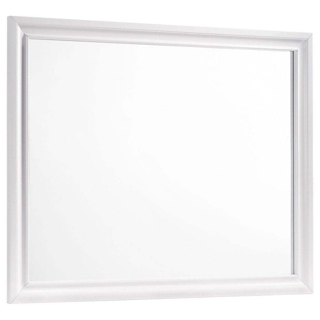 Get ready to add exquisite glamour to your space with this white upholstered bedroom set. The dramatic headboard offers incredible contemporary appeal with velvet upholstery, button tufting, crystal-like accents and hand-applied nailhead trim with a chrome finish. The matching nightstand comes equipped with a crocodile textured door panel and a glimmery chrome top drawer panel. The seven-drawer dresser with mirror and optional five-drawer chest offers the same texture and sparkly finish. Sleek chrome bar pulls perfectly complement the tapered legs on the panel bed and the bun style feet for the storage pieces.