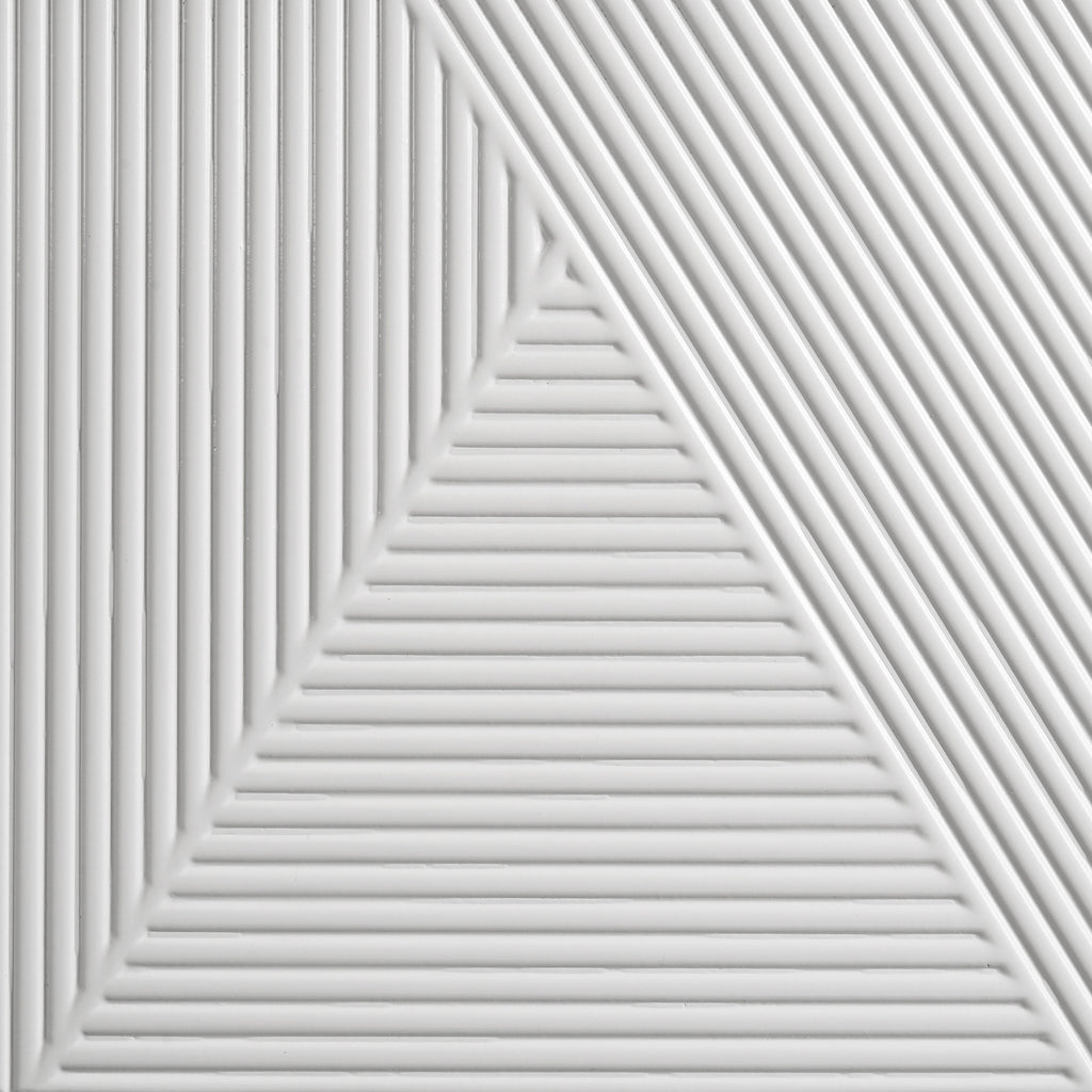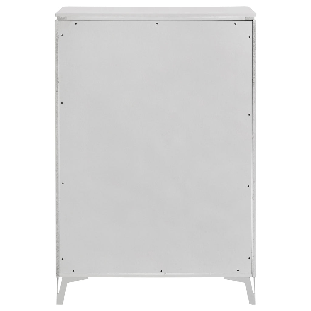 With a sleek high gloss finish and sculptural texture, this five-drawer chest makes a striking addition to the modern bedroom. Its geometric drawer fronts feature ribbed V-patterns that shift across each tier, accented by polished chrome U-shaped pulls. The top drawer is lined in black felt for delicate storage, while all drawers operate smoothly on 45mm metal extension glides. Elevated on tapered chrome-finished legs, this chest offers elevated storage with sharp visual impact. Key Features: • Five-drawer chest in white high gloss finish with sculptural ribbed geometric drawer fronts • Top drawer is fully lined in black felt to protect jewelry and delicate items • 45mm metal extension drawer glides ensure smooth and consistent drawer performance • Polished chrome U-shaped pulls add sleek contrast to textured sculptural surfaces • Tall vertical form provides generous storage in a modern, compact footprint • Crafted from engineered wood for style, structure, and longevity