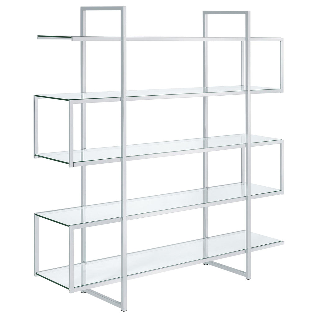 Jump on a trendy, modern bandwagon. Refresh a contemporary space with a stylish piece designed to organize and display. This four-tier bookcase offers a cool profile with personality. Tempered glass shelves blend perfectly with a steel frame. Make room for books, photos, and decor on this edgy, attitude-rich piece.