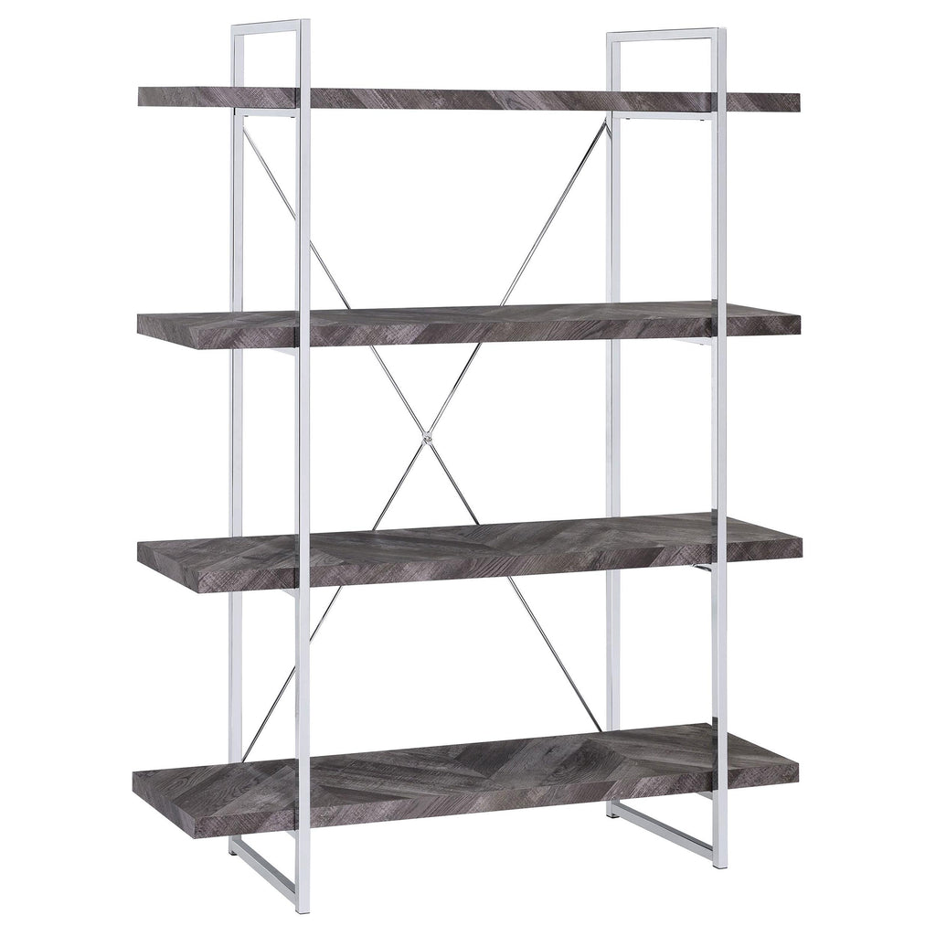 Enhance your storage and display space with this contemporary bookshelf, featuring a rustic grey herringbone finish for a modern organic touch. The sleek chrome metal frame provides durability and style, complemented by an X-shaped back support for stability. Four open shelves extend beyond the frame, creating a bold, geometric aesthetic perfect for showcasing books, décor, or collectibles. Crafted from engineered wood and metal, this shelving unit blends industrial and modern styles seamlessly, making it a stunning addition to living rooms, offices, or bedrooms.
