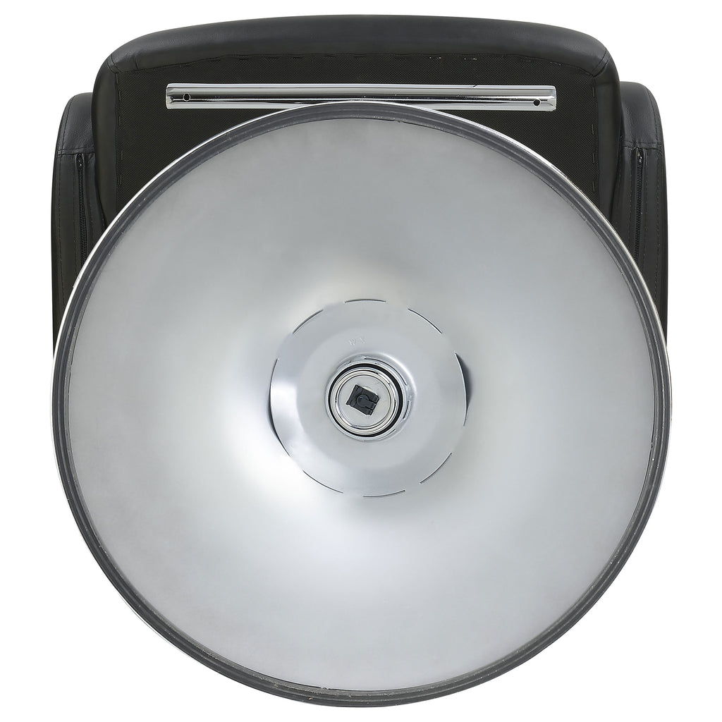 Expressive and interesting design elements team up to deliver a fun look. Make a modern or transitional space flush with style. This bar stool borrows from a retro theme with a hint of barbershop charm. An ergonomically positive seat, back, and arms encased in black upholstery match with virtually any palette. A bright, shiny chrome base with a bar footrest looks sleek and dynamic, and adjustable seat heights accommodate a bar table or counter. Key Features: • Expressive design elements create a fun look, combining retro and barbershop charm with a bright, shiny chrome base and adjustable seat heights • Ergonomically positive seat, back, and arms encased in black upholstery match with virtually any palette • Make a modern or transitional space flush with style • Bright, shiny chrome base with a bar footrest looks sleek and dynamic • Adjustable seat heights accommodate a bar table or counter