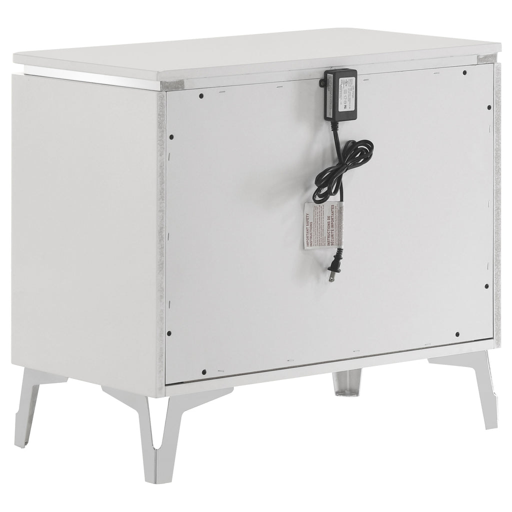With its sculptural drawer fronts and crisp white high gloss finish, this nightstand brings a fresh, modern edge to the bedroom. Two spacious drawers feature dimensional geometric textures and sleek chrome-finished pulls, while the top drawer is lined in black felt for added refinement. Built-in USB-A and USB-C ports on the back offer convenient charging access. Metal extension glides and polished surface details complete this bold yet functional bedside table. Key Features: • Modern nightstand in white high gloss finish features sculptural geometric drawer fronts • Dual USB charging port includes both USB-A and USB-C access at the back for convenience • Two drawers offer storage with top drawer fully lined in black felt for a refined interior • Chrome-finished drawer pulls complement the bold dimensional pattern and sleek surface • Equipped with 45mm metal extension glides for smooth and quiet operation • Crafted from engineered wood for clean lines and durable everyday use