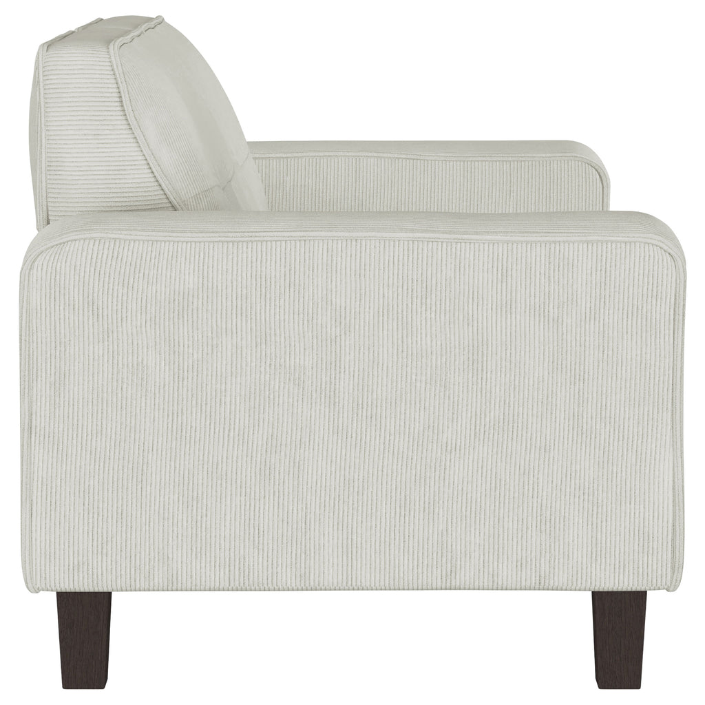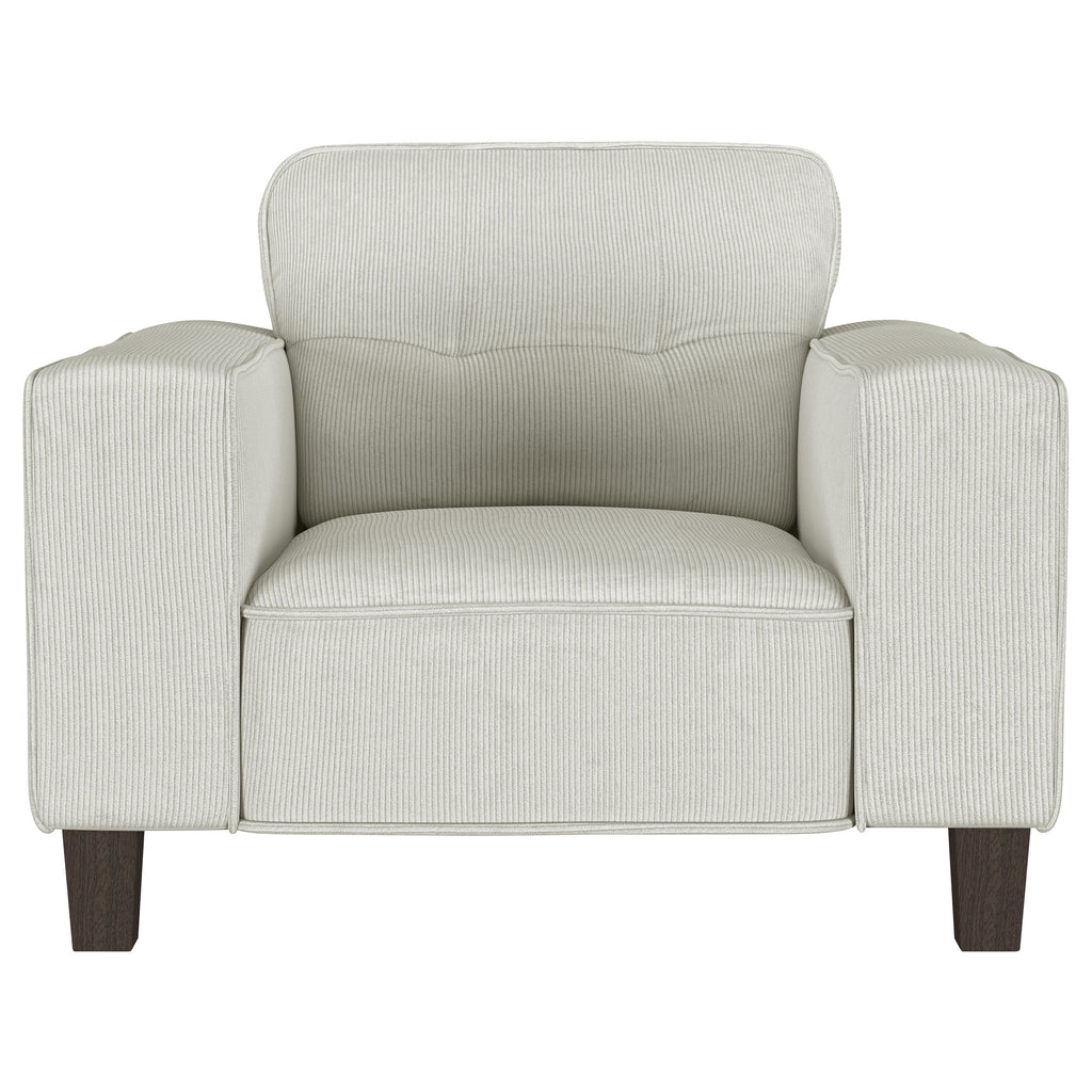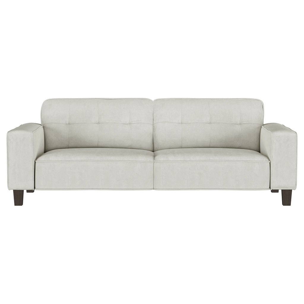Infuse tailored elegance with the tufted details of a modern sofa set. Featuring a three-seat sofa and two-seat loveseat, this set offers a refined anchor for your living room seating. Smooth, soft upholstery adds neutral color, while plush foam and sinuous springs ensure optimal comfort. The sofa and loveseat each feature tufted back cushions, offering a refined touch of mid-century charm. Track arms define a straight, clean-lined silhouette that's simply timeless and each piece stands on dark brown finished tapered wooden legs that add airy height. Key Features: • Hints of mid-century character infuse charm into a two-piece modern sofa set • Plush back cushions are tufted to create a sense of depth and dimension in your living room • Inviting upholstery and plush foam cushions create incredible comfort for lounging or entertaining • Timeless silhouette features tapering dark brown finished wooden legs and wide, straight track arms • Sinuous spring decking supports seats and back for incredible comfort and support that lasts