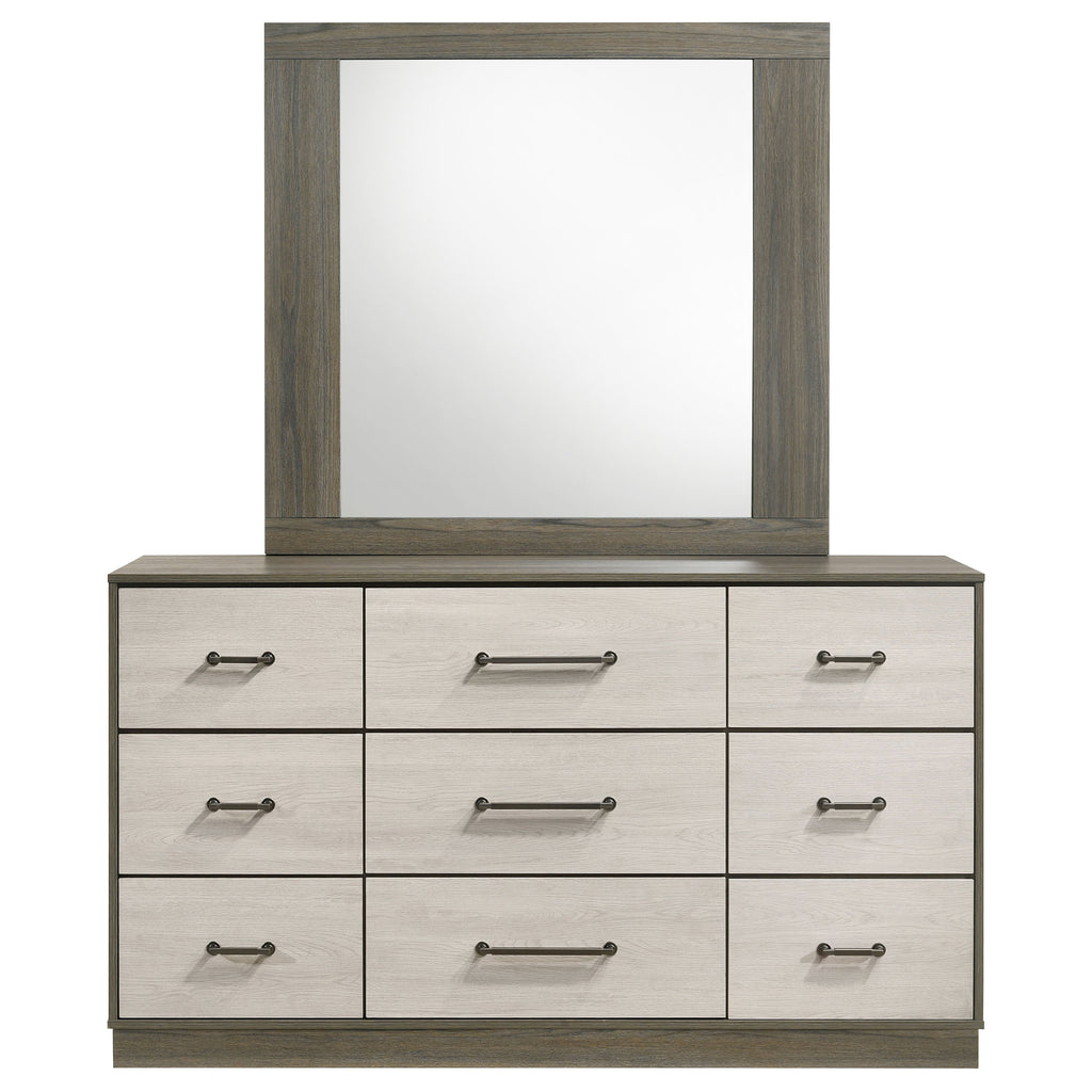 Elevate your bedroom decor with this sophisticated dresser and mirror set, blending contemporary style with functional design. The nine-drawer dresser offers ample storage, featuring a hidden jewelry drawer for added convenience, and is adorned with antique nickel handles for a touch of vintage charm. The dresser is complemented by a matching mirror, framed in a sleek two-tone melamine that blends natural wood tones for a modern look. Both pieces are crafted from durable melamine, particle board, and MDF, ensuring lasting quality. This set not only enhances the aesthetic of your bedroom but also provides practical storage solutions for a well-organized space. Key Features: • Dresser and mirror set with a contemporary two-tone melamine design • Nine-drawer dresser includes a hidden jewelry drawer for discreet storage • Antique nickel handles add vintage charm and elegance • Mirror framed in a sleek two-tone melamine that complements the dresser • Durable construction using melamine and engineered wood for lasting quality