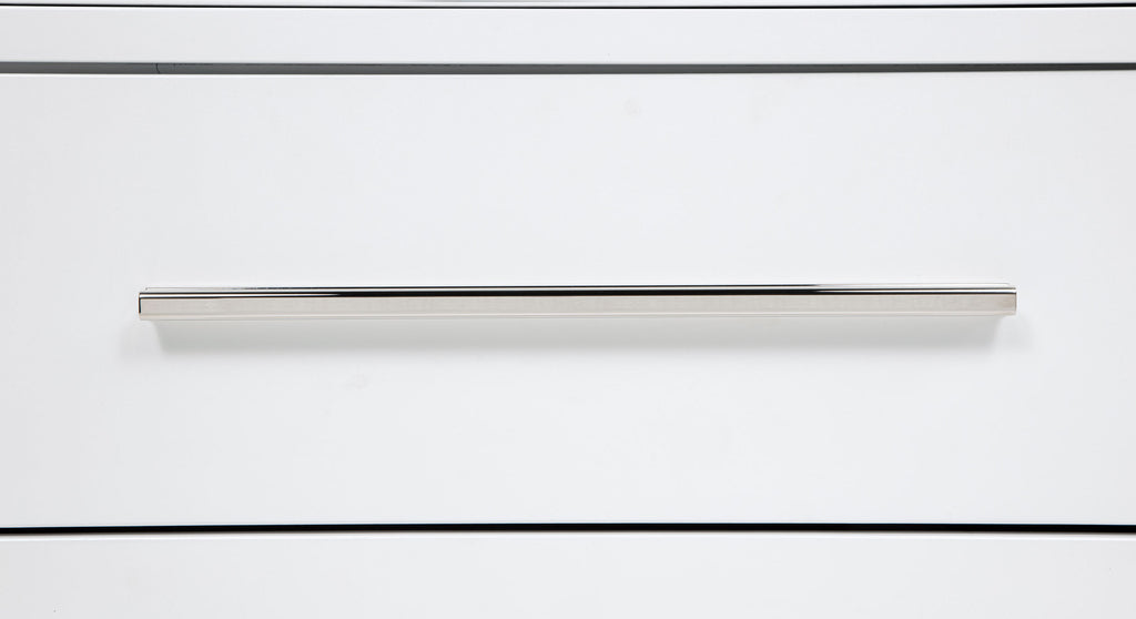 This eight-drawer dresser and mirror set captures contemporary elegance through subtle curves and polished detail. Elongated brushed nickel pulls and sleek metal tube accents highlight the silhouette, while the framed mirror adds dimension and balance. Made from solid rubberwood, engineered wood, and a smooth laminate veneer, the dresser drawers glide on heavy-duty tracks and feature felt-lined top compartments for added refinement. Key Features: • Eight-drawer dresser with framed mirror and soft, contemporary rounded silhouette • White finish pairs with brushed nickel handles and sleek vertical tube accents • Top drawers include felt lining and tinted interiors with dovetail construction • French dovetail front and English dovetail back glide on 45mm metal runners • Constructed from solid rubberwood, engineered wood, and laminate veneer • Mirror attaches securely to dresser; tip-over restraint system included