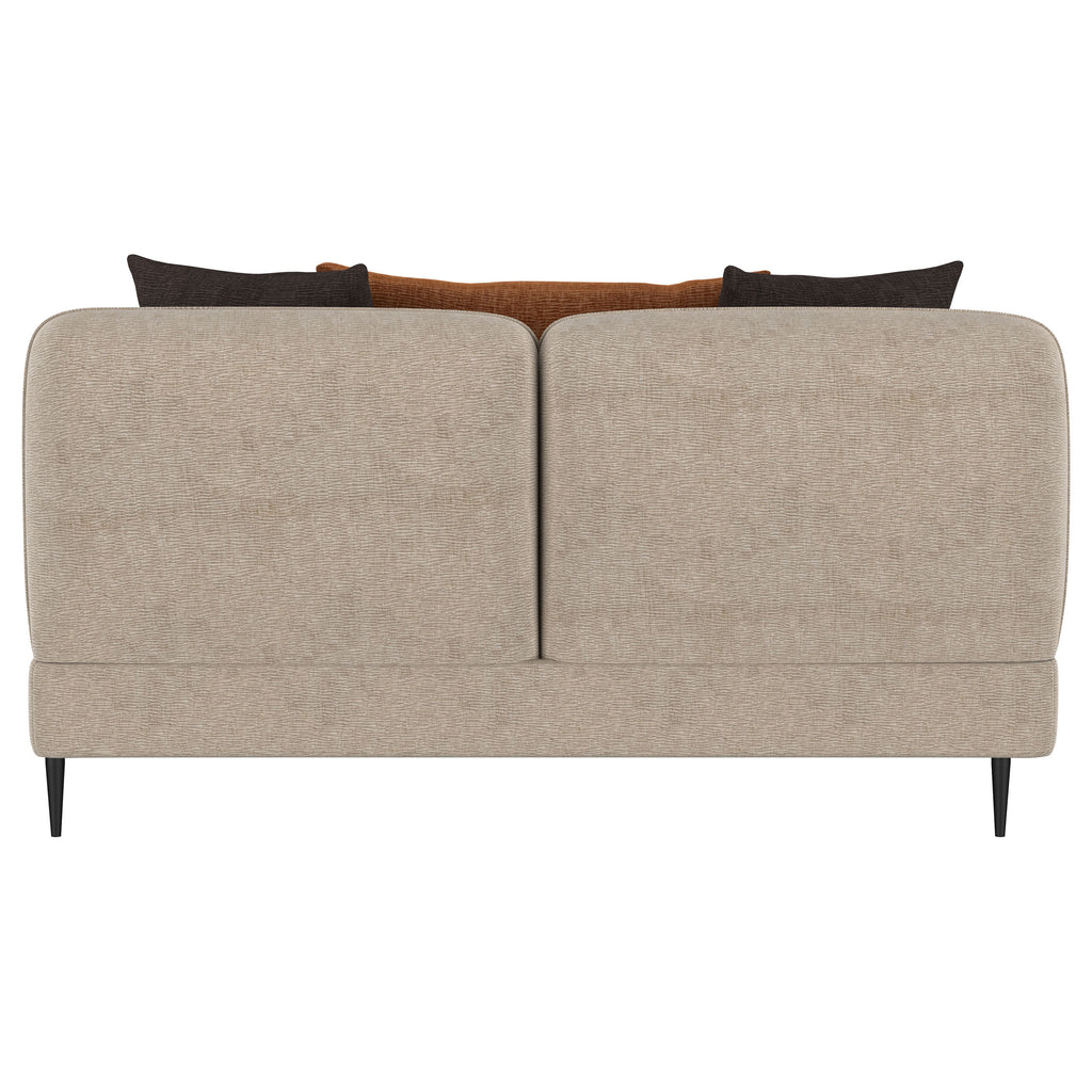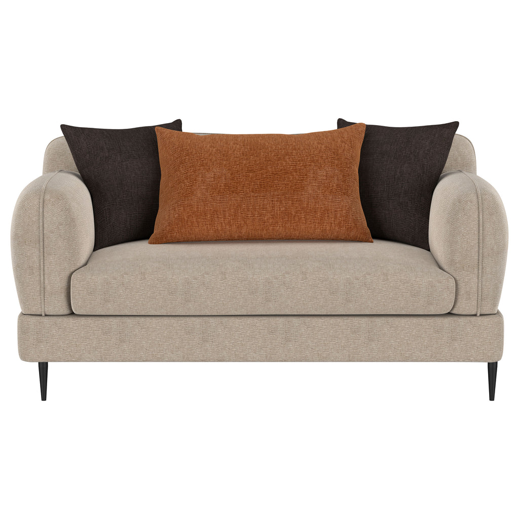 The loveseat blends chic architectural elements with cozy sophistication, wrapped in latte chenille upholstery for a soft, textured feel. Its rounded, sculpted track arms and matching back provide a harmonious design, accented by a sleek waterfall bench seat. Rust and chocolate reversible pillows add inviting contrast, while slender tapered metal legs enhance its contemporary flair. A sinuous spring seat deck, full foam cushions, and fiber-filled back ensure optimal comfort and durability for everyday lounging.