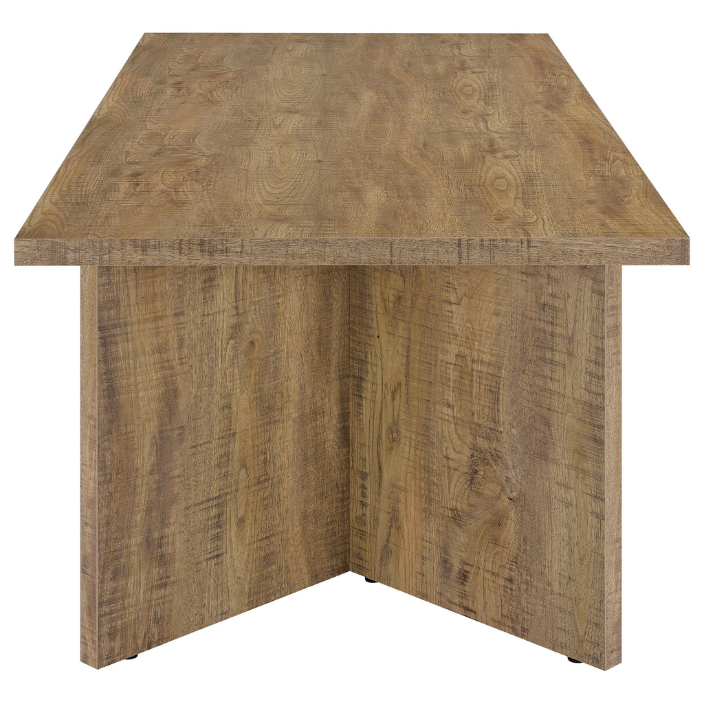 Sit down to delicious meals at a stylish, casual contemporary dining table. The classic rectangular table design features a mango wood-like decorative paper veneer that imparts character with its impressive dimension and texturing. The engaging table design is elevated with a pair of V-shaped pedestals connected with a support plank to create a bold, geometric look to center your kitchen or dining room. The table provides plenty of space for family and friends with its versatile size. Add a ceramic centerpiece to perfectly complement the earthy, organic look.