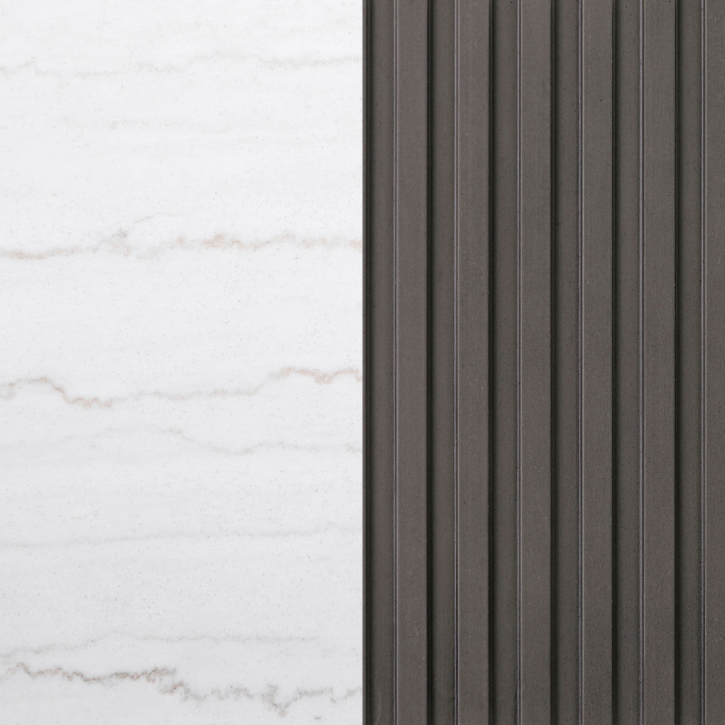 Center your living space with this elegant, modern round coffee table. The genuine white marble top exudes sophistication with its subtle veining, adding organic flair. The clean, light coloration complements any surrounding decor. A ribbed, engineered wood frame in a charcoal finish creates texture and depth, while the brushed gold metal base brings a luxurious touch. This piece seamlessly blends refined materials and design, making it the perfect addition to your living room.