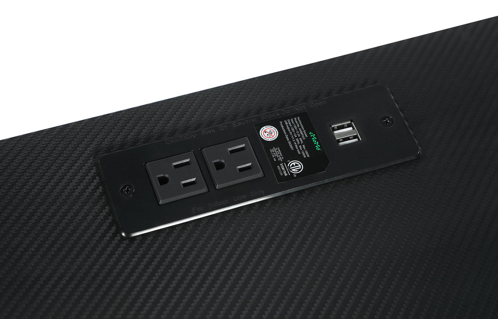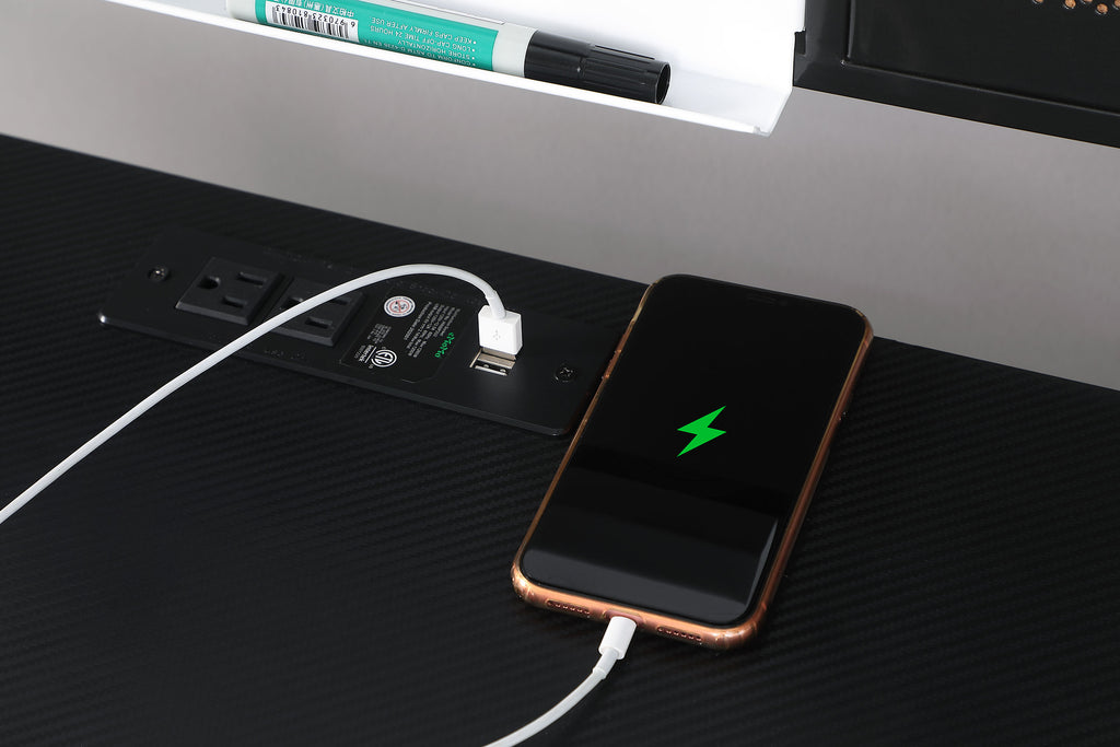 Slender mid-century-inspired metal tube legs angle outward, adding expression to the minimal, water and stain-resistant black finish of this modern writing desk. Complete with a black finished workspace and gunmetal finished accents, this writing desk lends itself to many color palettes while offering ultimate functionality in the space. Modern touches like two built-in USB ports, an AC outlet, and a wireless charger allow you to stay connected. Above the desk is a whiteboard setup, cup and water bottle holders, and extra hooks for organizing all your essentials. Compact, yet stylish, this modern-inspired writing desk also offers extra open shelves for storing books and files. Key Features: • Multi-functional desk fits into any space-saving living area • Features a water and stain-resistant carbon fiber textured PVC desk top • Two built-in USB ports and AC outlet for easy charging • Convenient built-in wireless charger for your phone • Constructed with MDF, particle board with carbon fiber PVC, and metal tubes