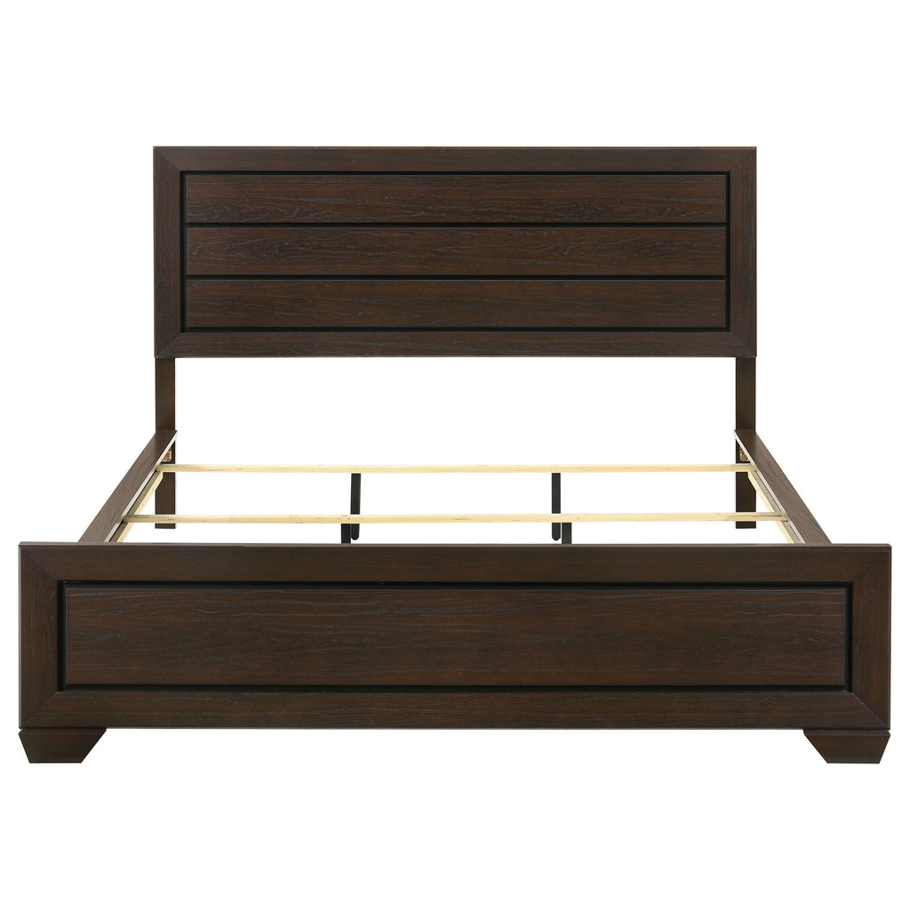 Make a statement in a transitional room. Cherish the linear styling and fresh finish of this sophisticated bed. An extra high headboard with horizontal planks hint at a nature-inspired theme. With a gorgeous grey patina in a greyish brown tone, its washed taupe finish is wonderfully versatile. A framed case front adds dimension and elegance. Key Features: • Panel bed with horizontal recessed detailing and bold rectangular framing • Washed taupe finish showcases wood grain with black contrast groove accents • Picture frame styling on headboard and footboard adds structure and depth • Requires foundation and includes a supportive slat system with center legs • Stands on sturdy tapered feet that elevate the streamlined silhouette • Built from engineered wood with a durable laminate and composite core