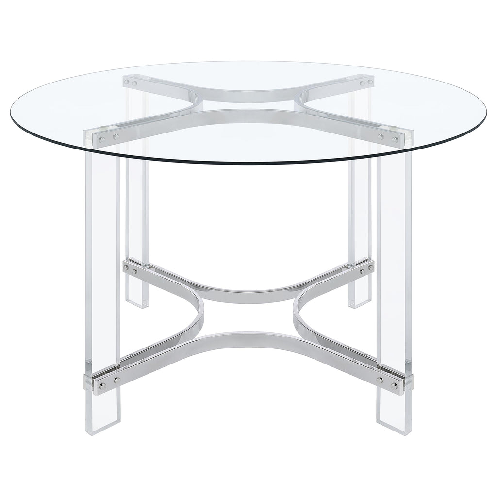 Center your dining experience on a chic, modern round dining table with sculptural appeal. It boasts four straight clear acrylic legs with four-point star bases that create incredible stability. The gleaming chrome finish stands out, adding artistry to your kitchen or dining room. The table is topped with a round of clear glass, adding to its airy ambiance. This contemporary table comfortably seats four, perfect for a breakfast nook or compact dining room. Key Features: • A modern round dining table is crafted for airy lightness perfect for a contemporary dining room • Chrome finish four-point star braces create striking sculptural appeal in a kitchen or dining room • Round tabletop features clear glass that allows artistic structural design to take center stage • Straight, rectangular post legs are made from clear acrylic for a light, airy appearance • Legs feature plastic glides for smooth performance no matter the floor type in your dining space