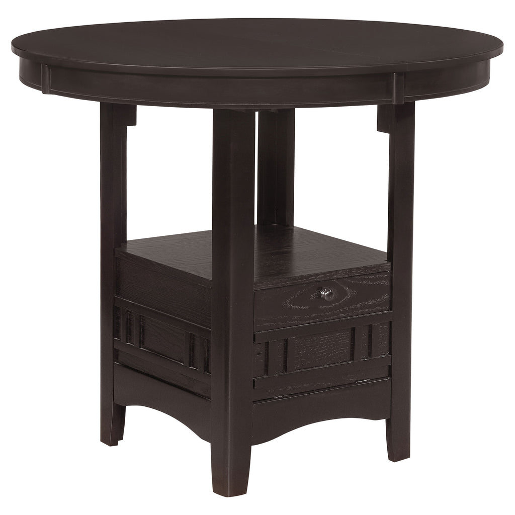 Counter height modern dining table from the Lavon Collection. Features 18" extension leaf for added space when needed. Oval table top invites intimate conversation over dinner or dessert. Base features top shelf and inner storage shelf so you're always prepared. Complete the set with matching chairs finished in light chestnut and espresso. Key Features: • Oval counter height dining table with extension leaf for added seating capacity when needed • Light chestnut tabletop contrasts with espresso base for a rich two-tone appearance • Table base includes open shelf and concealed lower cabinet for built-in storage • Smooth curved edges create a welcoming silhouette for casual dining settings • Crafted from solid rubberwood, cherry veneer, engineered wood, and plywood • Assembly required with durable frame ideal for kitchen or dining room placement