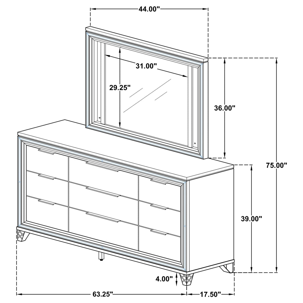 Elevate your bedroom decor with this stunning dresser and mirror set, featuring a modern Italian design with a striking white finish. The dresser offers ample storage with nine drawers, picture framed recessed panels, and embossed herringbone graphic patterns, while the mirror adds a touch of sophistication with its mirror framing and touch LED light. Accented with polished chrome metal hardware and acrylic legs, this set combines style and functionality. Crafted from rubberwood, MDF, and mirror, this dresser and mirror set is a perfect addition to your luxurious bedroom. Key Features: • Dresser and mirror set with modern Italian design • Striking white finish with mirror framing and polished chrome metal hardware • Dresser with nine drawers, picture framed recessed panels, and embossed herringbone graphic patterns • Mirror with touch LED light for added sophistication • Crafted from rubberwood, MDF, and mirror