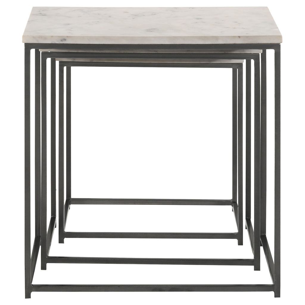 This nesting table set features genuine white marble tops and a sleek metal frame in a gunmetal powder-coated finish. Ideal for compact spaces, the tables stack neatly to save room, providing flexibility when extra surface area is needed. With slim legs and an open box-like design, these occasional tables offer a modern touch. Perfect for creating a sophisticated yet functional arrangement, the set is equally practical when used separately or as a cohesive trio.