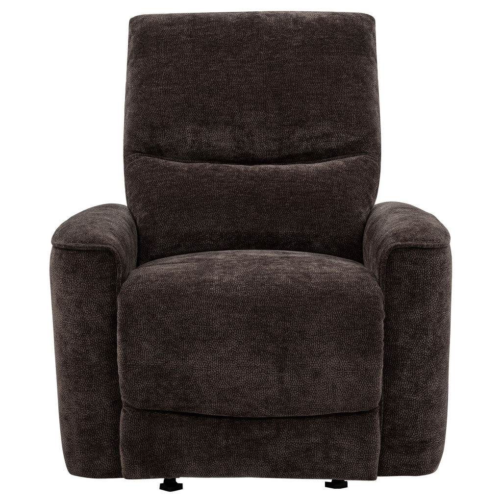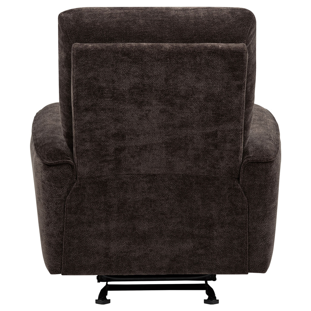 Designed for motion and comfort, this glider recliner cradles you in soft, supportive ease. Plush chenille upholstery adds a cozy touch, while channel tufting and generous padding offer full-body relaxation. With smooth reclining and gentle gliding action, it’s the perfect retreat after a long day. Built with durable wood, metal, and foam, this chair brings lasting comfort and a soothing rhythm to any casual living space. Key Features: • Glider recliner chair with manual recline and soothing motion for full-body relaxation • Dark brown chenille upholstery delivers soft, warm texture for everyday comfort • Channel-tufted backrest provides structured support with cushioned depth • Padded armrests and seat cradle you in plush, supportive ease • Crafted from fabric, metal, plywood, and foam for dependable long-term use • Perfect for casual living rooms or reading nooks needing soft motion and comfort