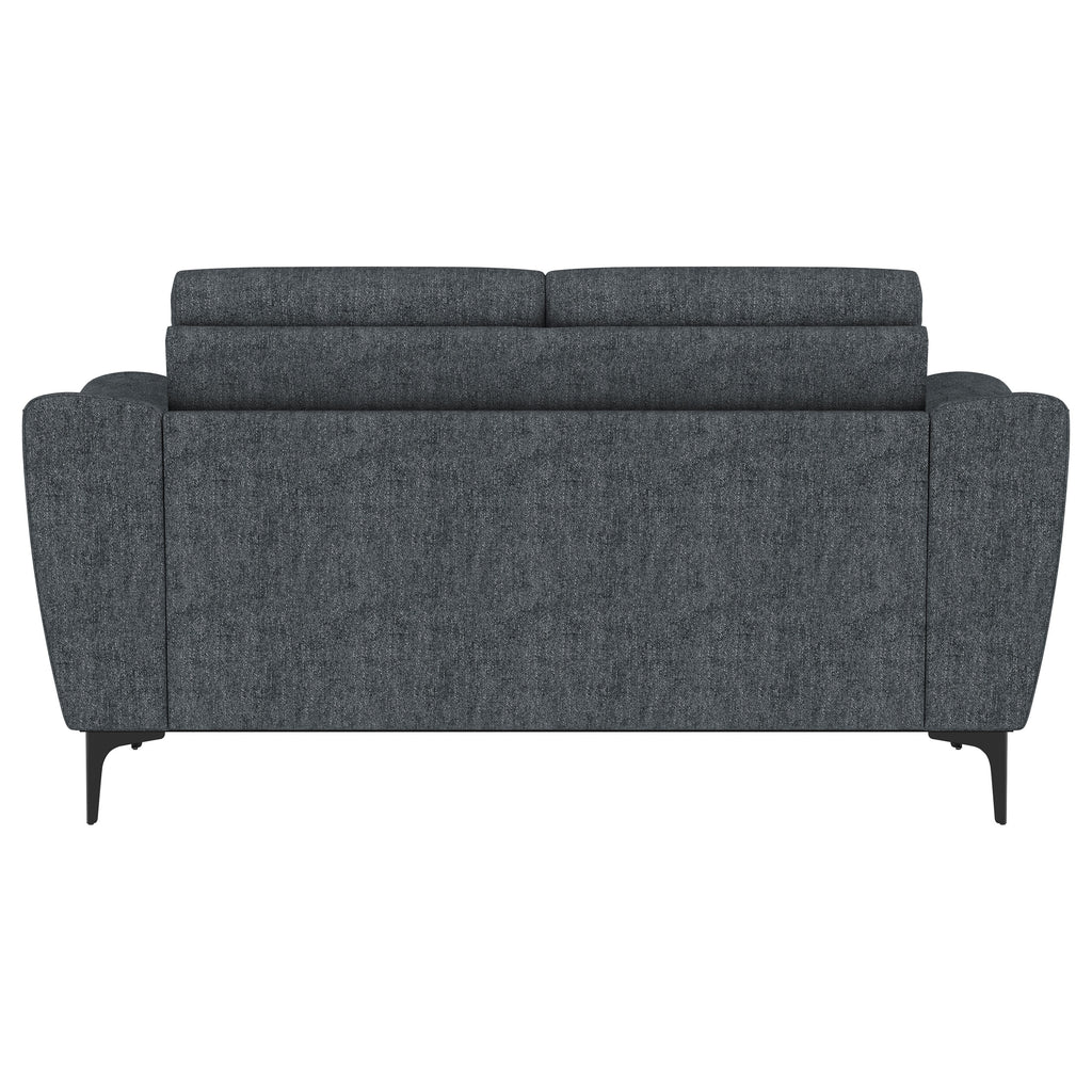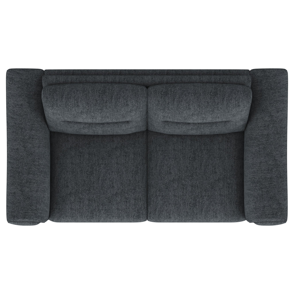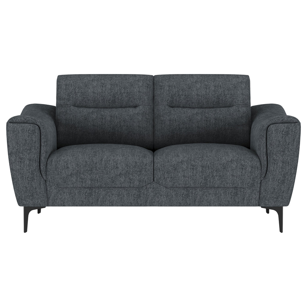 Indulge in effortless style and comfort with this chic transitional loveseat. Soft charcoal upholstery gracefully harmonizes with any décor, while plush pocket coil seat cushions and modern track arms provide inviting support for your downtime. Designed with attached cushions for a neat appearance and innovative metal legs that allow for easy assembly, this collection elevates the overall ambiance of your living space.