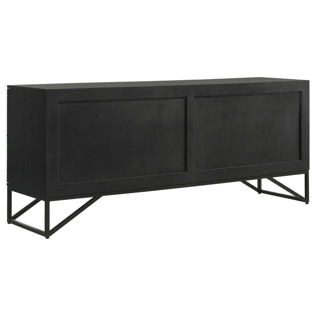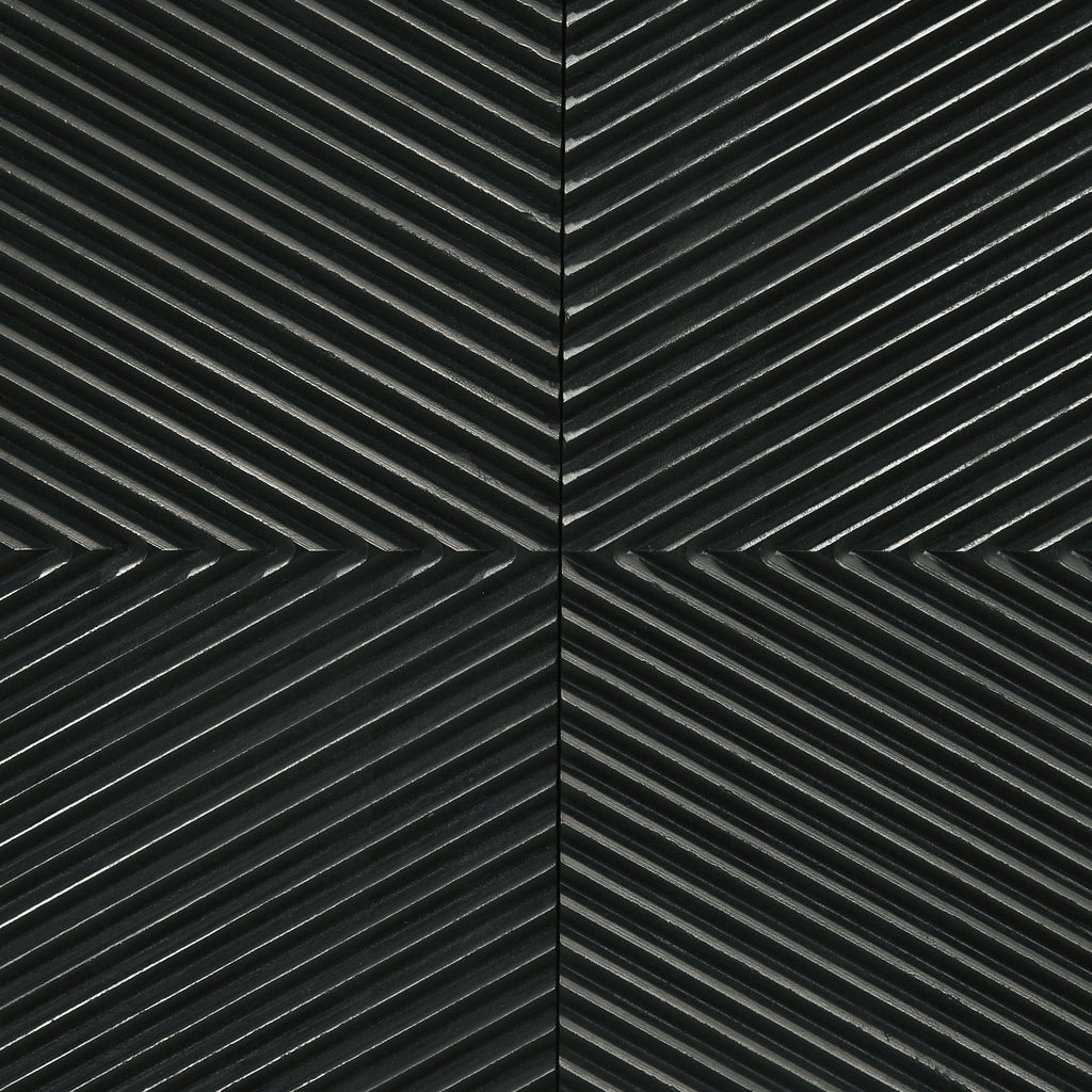 Bold finish composite wood and iron merge to create a stylish and durable four-door accent cabinet. Perfect for use in your dining room, living room, or media room, this chic cabinet is versatile and attractive. Diagonal self-striping adds textured effects on its door fronts to create a compelling look. Find space on two adjustable shelves behind four doors that open with matching black iron vertical pulls. Set atop a geometric black finish iron frame, this cabinet serves as a striking example of bold style.