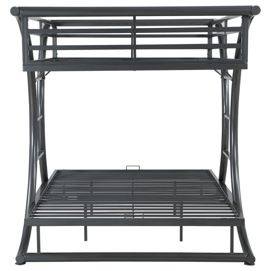 If traditional bunk beds tend to lend an air of fun to sleeping, then this Stephan full/full bunk bed imparts an amusement park type of air. Like most bunk beds, it comes with built in ladders for easy up-and-down access to the top. What sets this one apart is that the ladders on are on the sides instead of the ends and are curved! Although it conveys fun and youthfulness, the top bunk has side rail slats to ensure safety. Adding to the mystique is the dark gunmetal finish. Key Features: • Heavy duty metal bunk bed in sleek gunmetal finish • Dual curved design elements with built-in ladders on both sides • Available in twin-over-twin and full-over-full sizes • Full length guardrails on upper bunk • Constructed with steel • Slat kits included