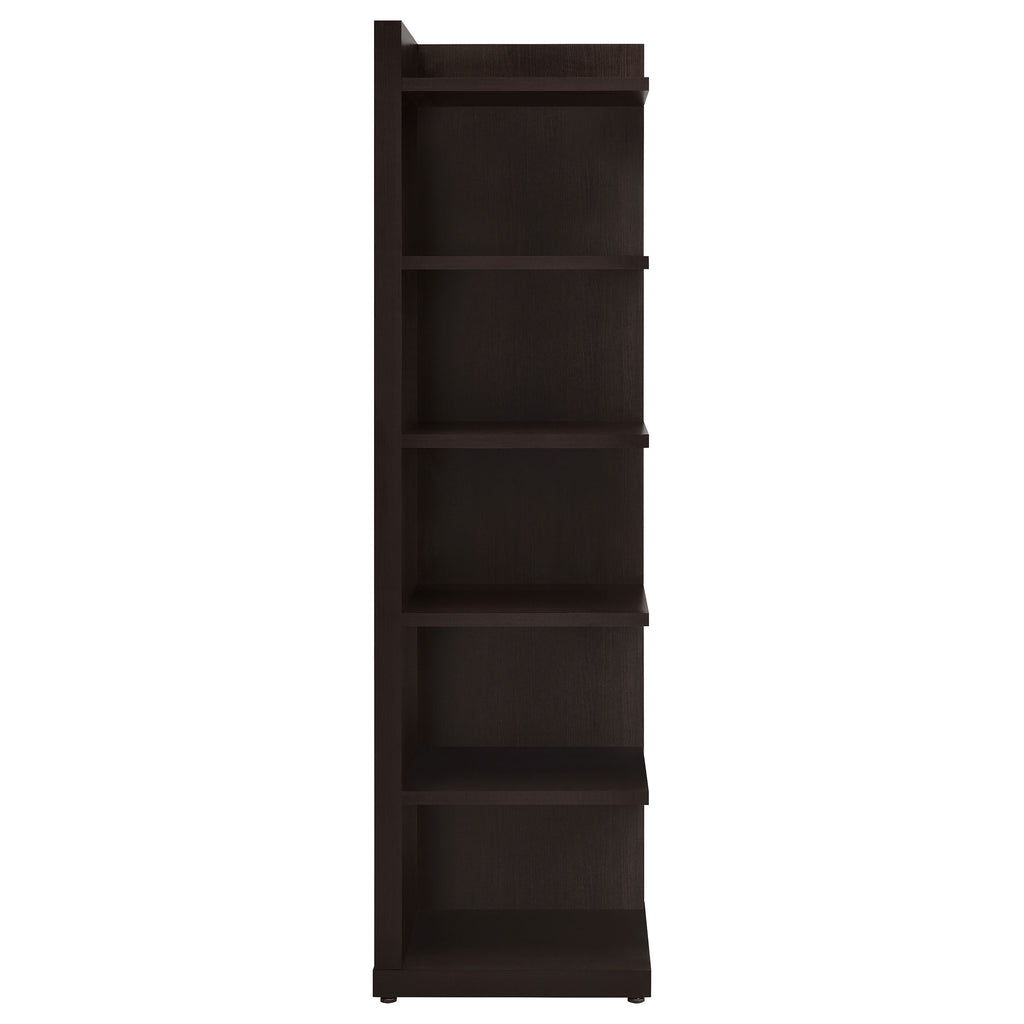 Display your book collection with style and pride. This bookcase features six convenient shelves to show off your personal library. Ideal for smaller spaces, it tucks neatly into a corner to free up precious square footage. A handsome cappuccino finish gives it a classically chic appearance. Crafted from durable MDF, particle board, and engineered veneer, this bookcase is strong, sturdy, and stunning.